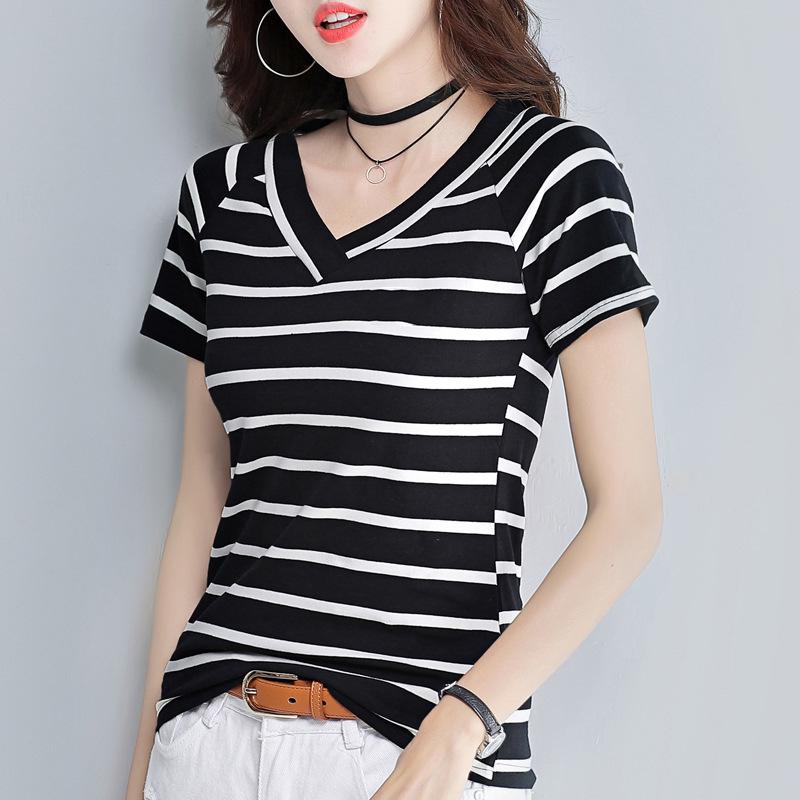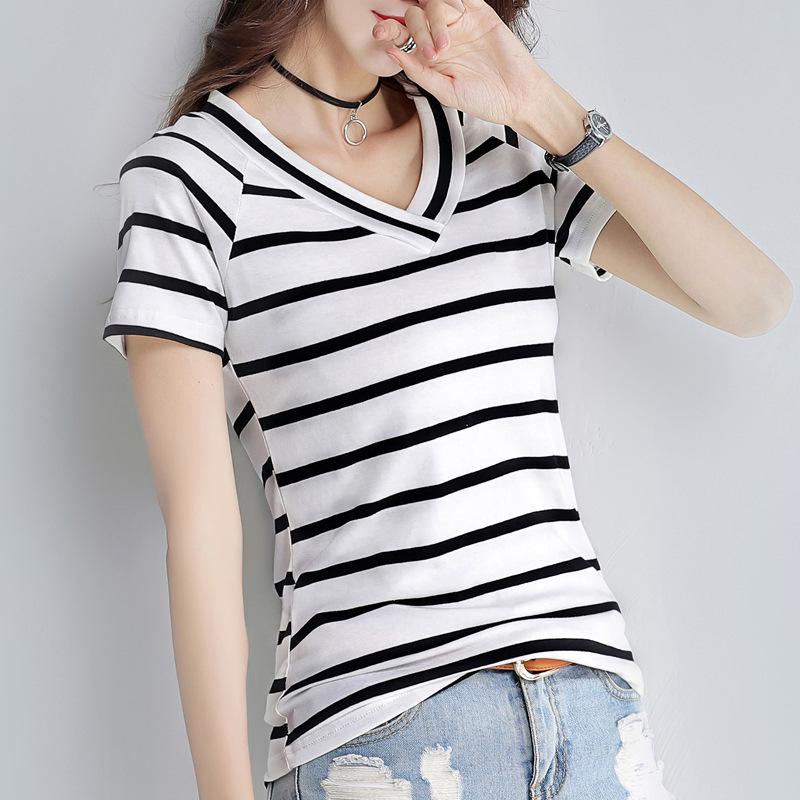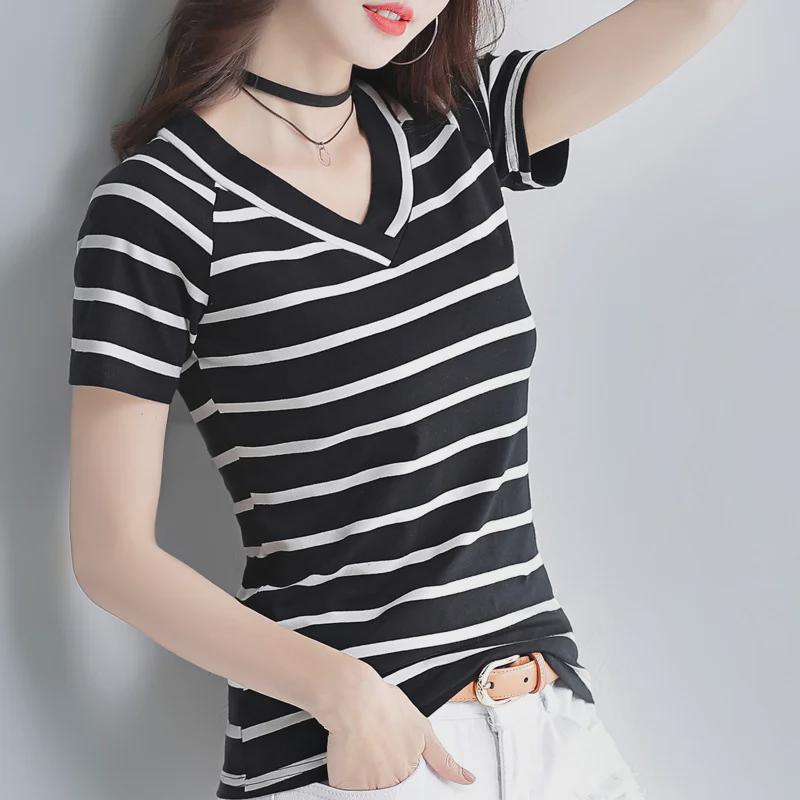Женская облегающая футболка с V-образным вырезом и короткими рукавами в полоску - летний трендовый топ в корейском стиле