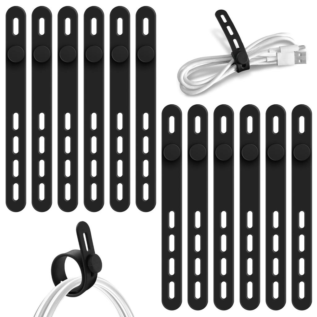 Силиконовый кабельный бандаж Lasocy, набор кабелей, 4 отверстия, регулировка, зажим для кабеля, многофункциональный кабельный бандаж, мягкий на ощупь, для хранения шнура, многоразовый, черный, 12 шт.