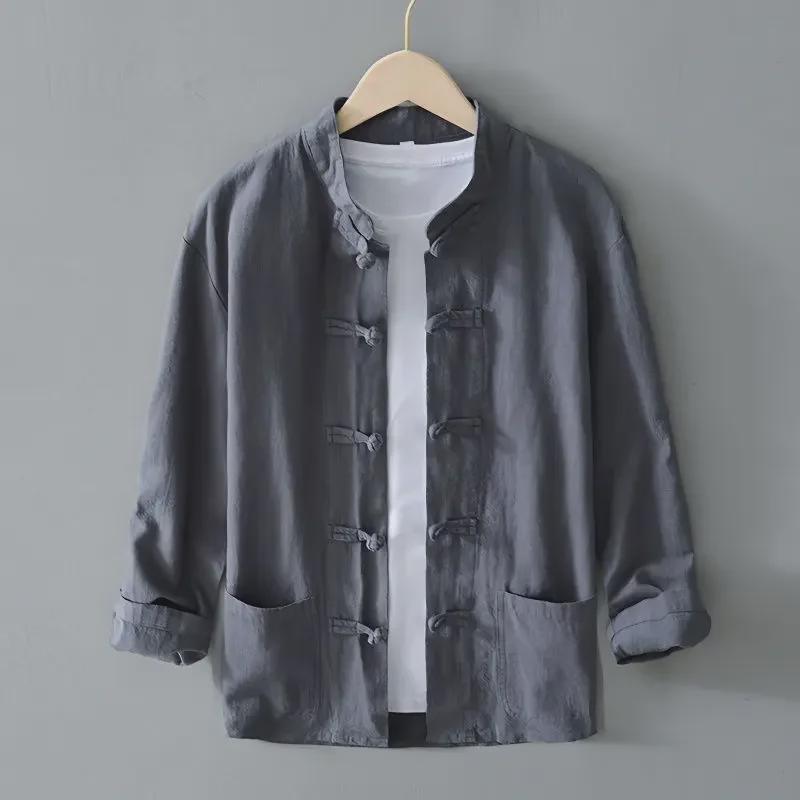 Мужская хлопчатобумажно-льняная рубашка в китайском стиле с пуговицами: Повседневный костюм Тан, свободный древний стиль Ханьфу, большой размер, топ среднего возраста