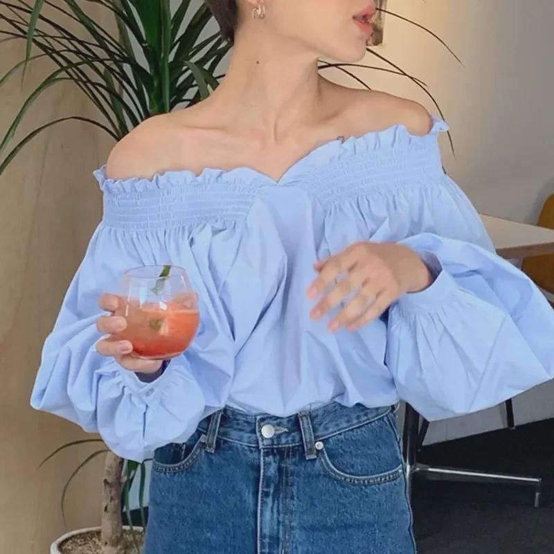 Корейский шик Двусторонняя рубашка с открытыми плечами и рукавами-фонариками для женщин - Французский молочно-голубой отбеливающий дизайн — купить товар онлайн с бесплатной доставкой по всему миру!