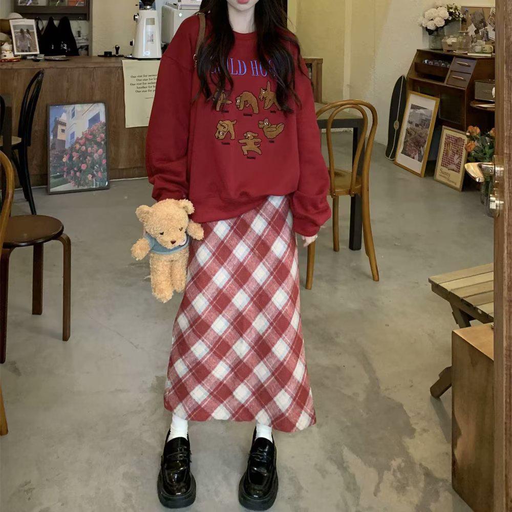 Красная шерстяная юбка в клетку с высокой талией для стройных фигур типа «груша» — корейский стиль, А-силуэт, идеально подходит для весны и осени