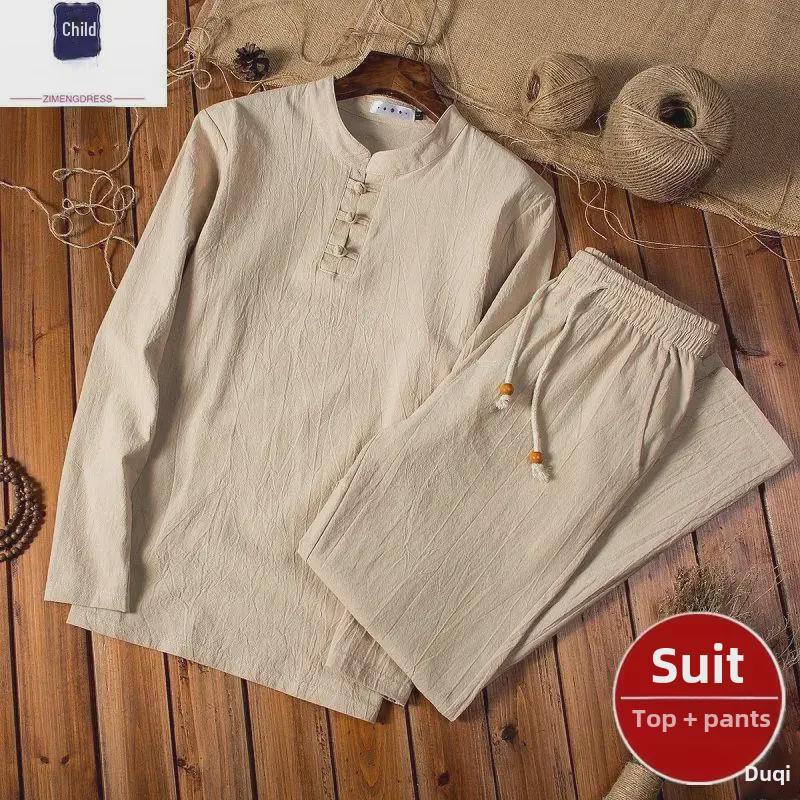 Мужской льняной костюм в китайском стиле: Летний комплект из двух предметов с футболкой с длинными рукавами, смесь хлопка и льна.