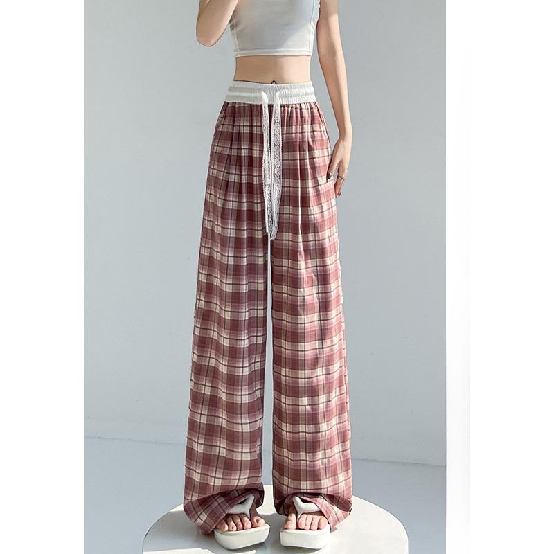 Широкие брюки в клетку с кружевом и завязками для женщин на весну и лето, с высокой талией, свободные повседневные брюки в пол с ленивым фасоном