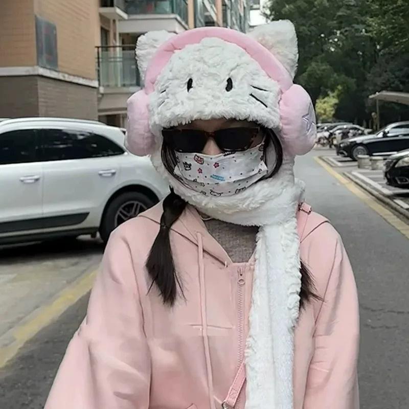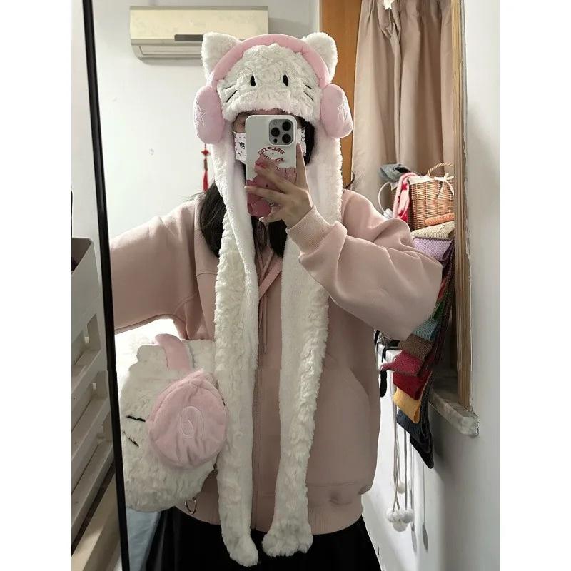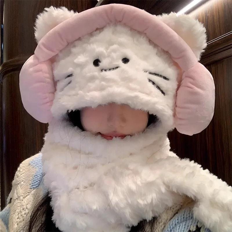 Корейские наушники 3 в 1, женские пушистые плюшевые теплые кошачьи ушки, шарф с капюшоном, шапка-ушанка, перчатки, варежки, мультяшный кот, теплая зимняя