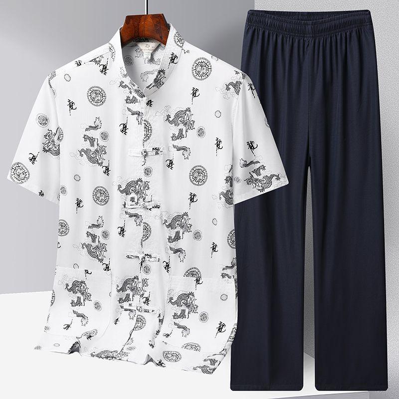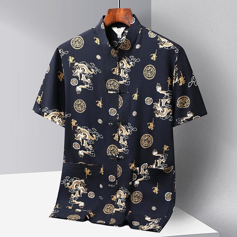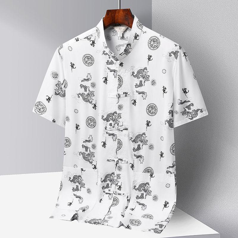Рубашка из хлопкового шелка, короткий рукав, принт, китайский стиль, летний кардиган с высоким воротом, топ из вискозы, мужской костюм в стиле Тан
