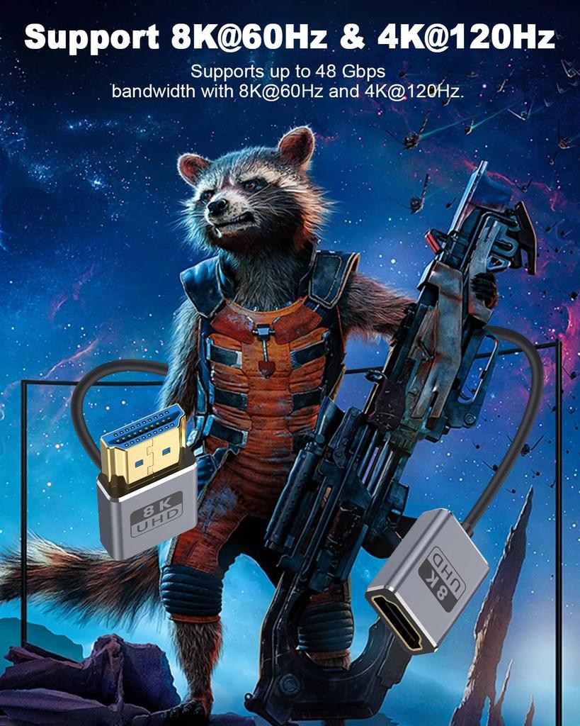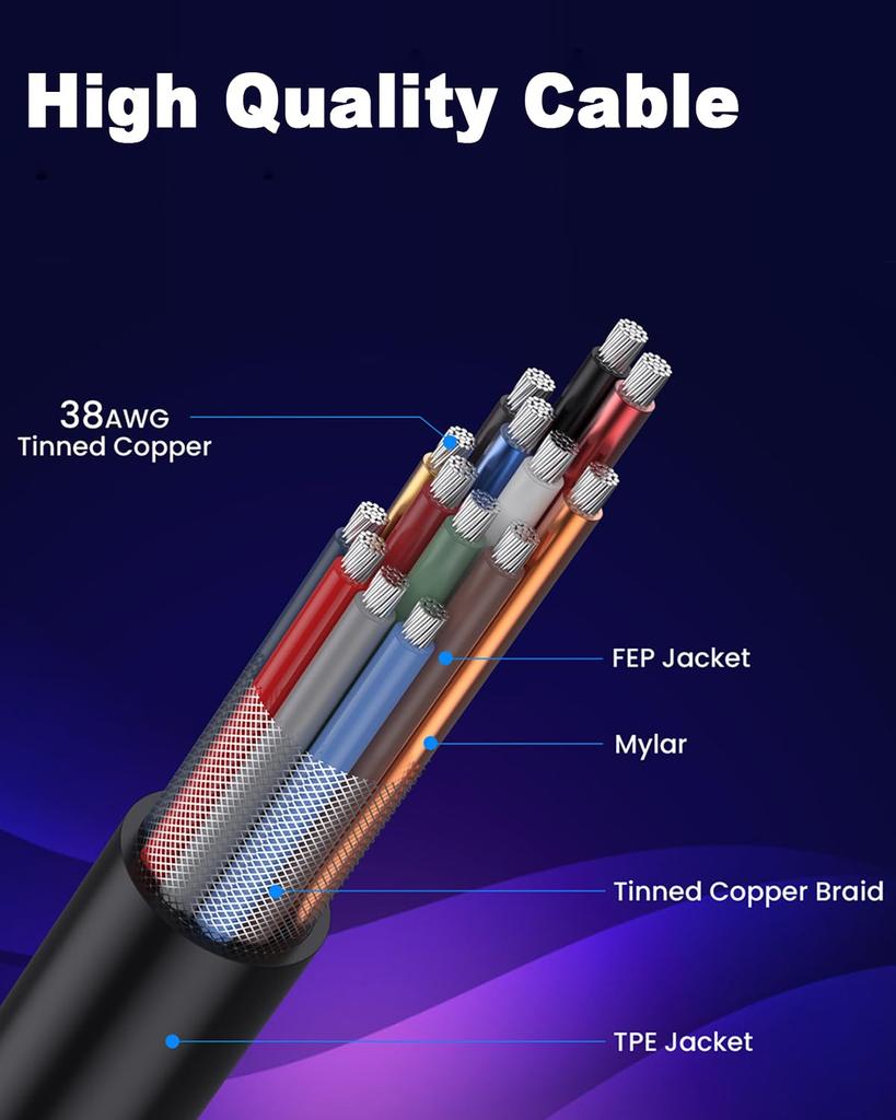 Короткий кабель HDMI 8K поддерживает пропускную способность до 48 Гбит/с и совместим с 8K@60 Гц и 4K@240 Гц. Коаксиальный кабель HDMI имеет двойное экранирование для предотвращения помех сигнала, эффективного снижения потерь сигнала и защиты видео и аудио от внешних электромагнитных помех без потери кадров или мерцания.