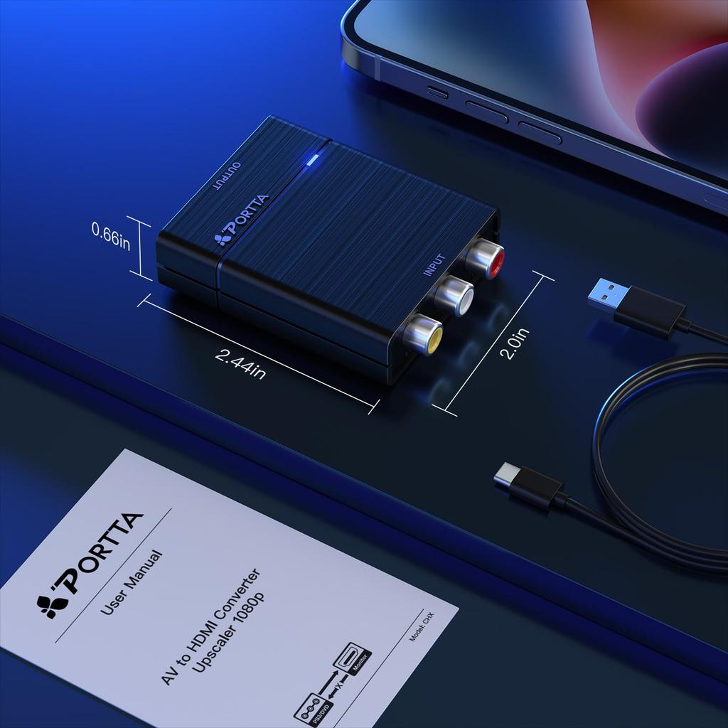 Конвертер Portta RCA в HDMI, AV в HDMI 1080P, RCA композитный (Красный, Белый, Желтый) 3-цветный терминальный HDMI-конвертер-адаптер, апскейлер, поддерживает PAL/NTSC, VHS, VCR, PS3, N64, Wii, STB, Xbox, проигрыватели Blu-Ray DVD