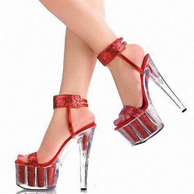 17Cm fish mouth fine high heel glitter crystal sandals women's summer simple waterproof table open-toe buckle thin women's shoes