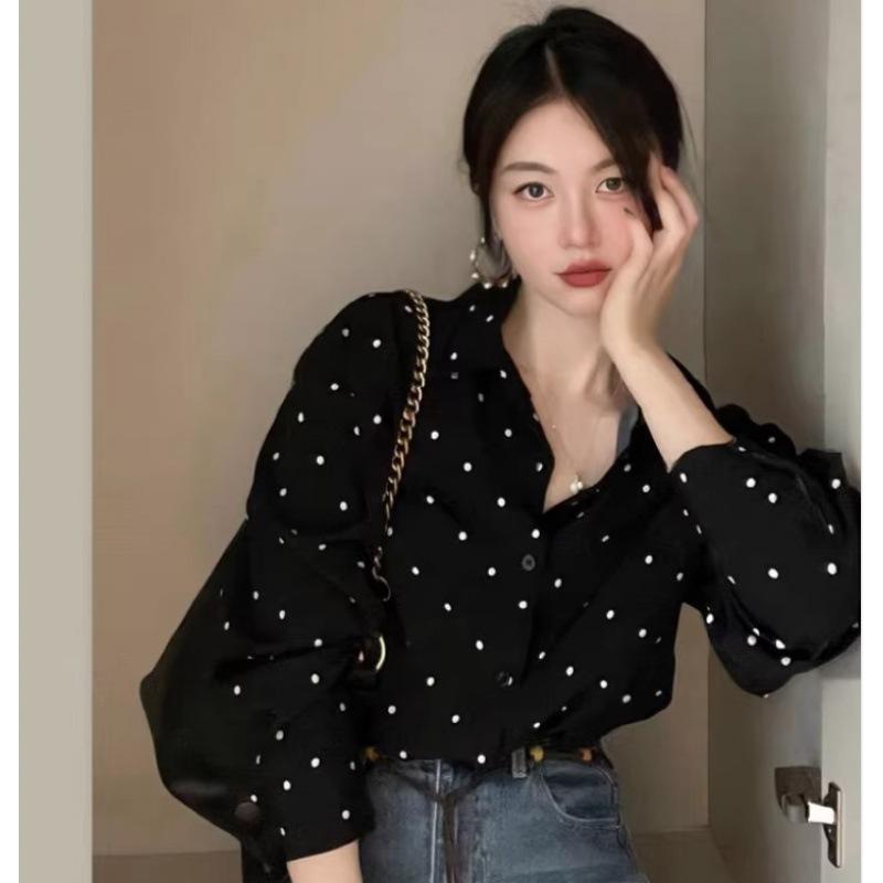Женская блузка с принтом в горошек, длинный рукав, свободный отложной воротник, женские рубашки — купить товар онлайн с бесплатной доставкой по всему миру!