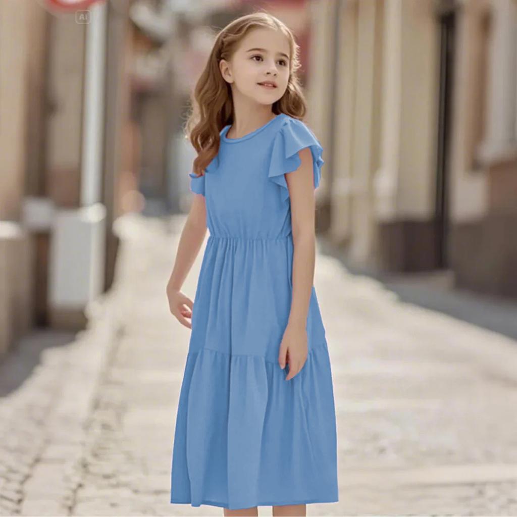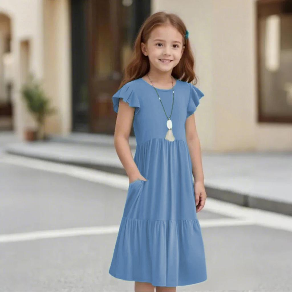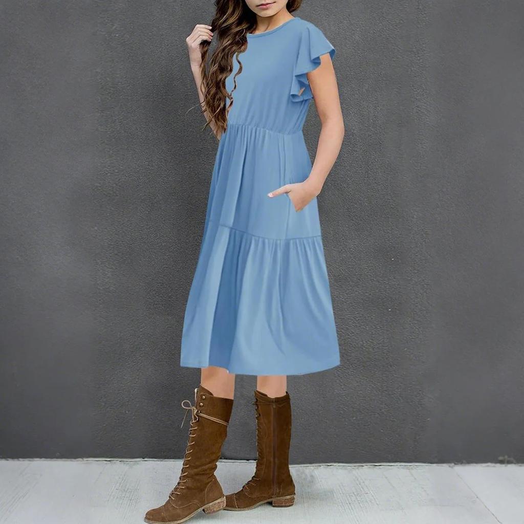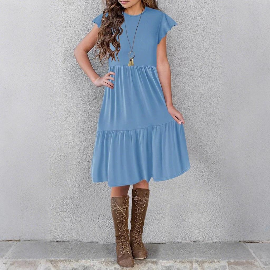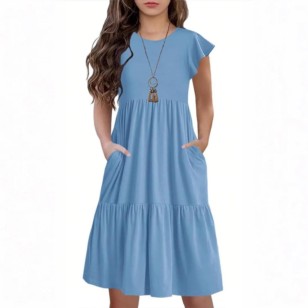 Детская юбка с круглым вырезом, плиссированная, с коротким рукавом, юбка принцессы, модное повседневное платье с карманами для девочек