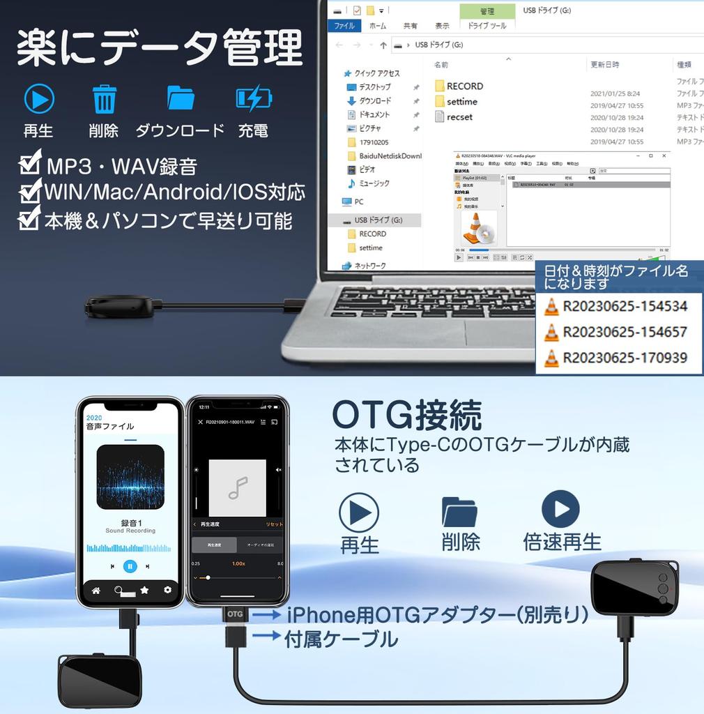 [45 ч непрерывной записи, 64 ГБ большой емкости, раздельная запись, 4550 часов хранения записей] Использует литий-ионный аккумулятор большой емкости 300 мАч, и при полной зарядке в течение 1,5 часов он может записывать и воспроизводить до 30 часов и непрерывно записывать в течение 45 часов, поэтому он рекомендуется для тех, кто использует его в течение длительного времени, например, на встречах и лекциях.. Оснащен 64 ГБ встроенной памяти, может хранить до 4550 часов записей.. Кроме того, удобно делить файл записи, позволяя выбирать от 10 до 240 минут! Функция раздельной записи очень удобна для экономии памяти, а благодаря разделению файлов с длительным временем записи становится проще управлять ими и проверять.. (Первоначальные настройки можно выполнить только на компьютере.. Вы можете записывать, не делая никаких настроек.)