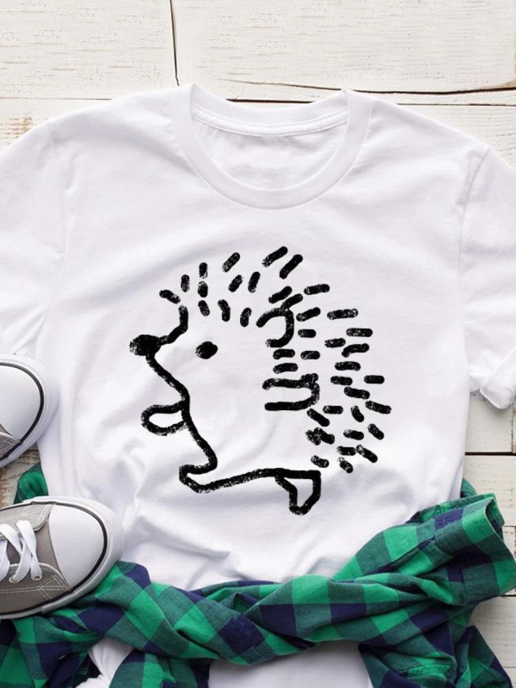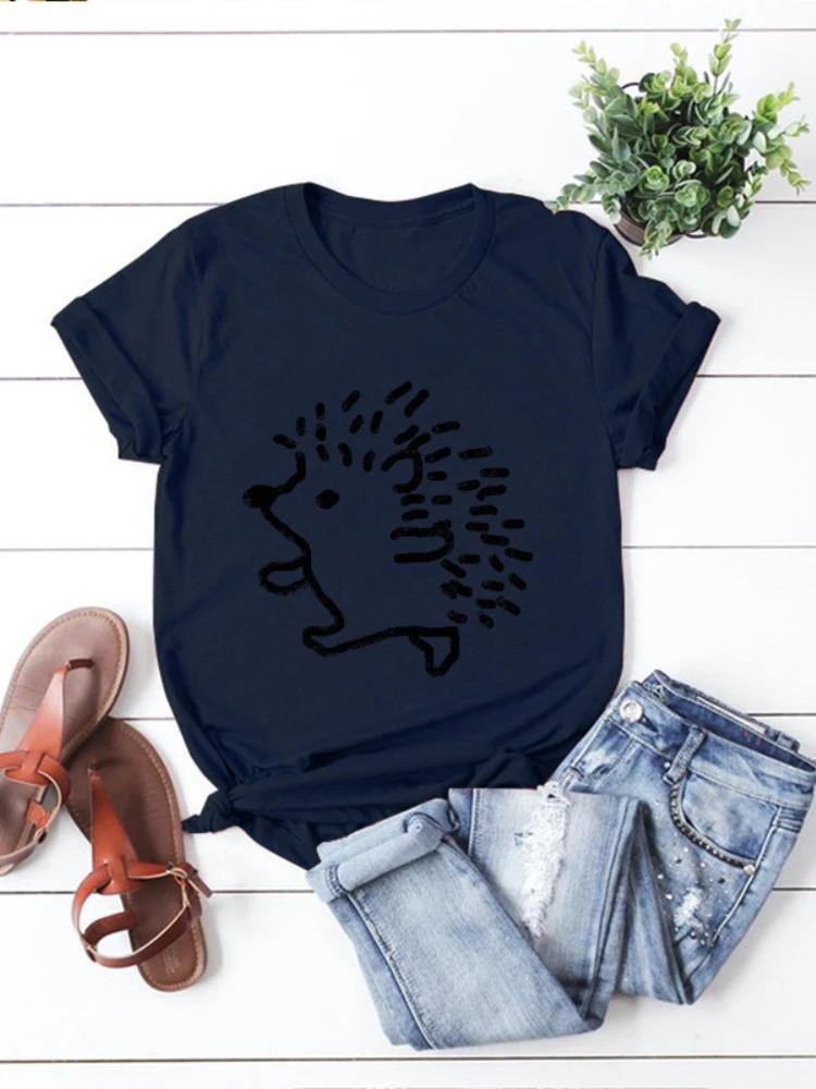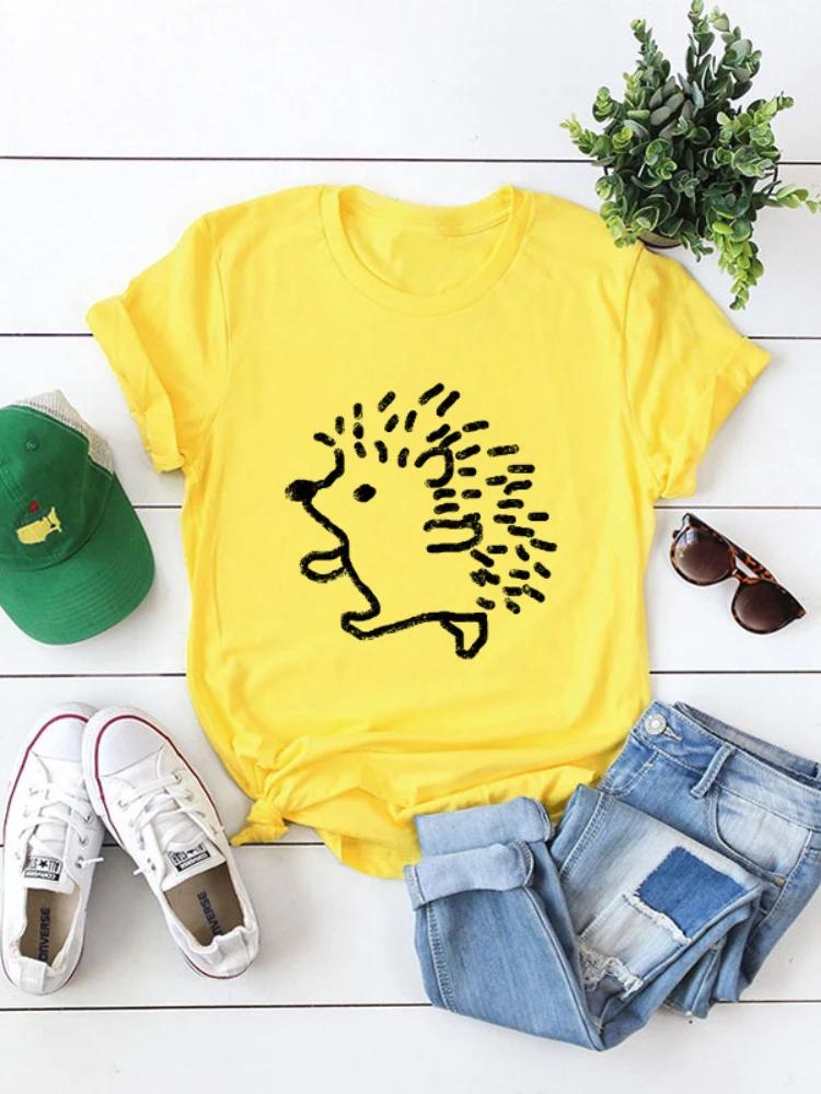 Забавный принт с изображением ежа Футболка женская с коротким рукавом O-образным вырезом Свободная женская футболка Женская летняя футболка Топы Одежда