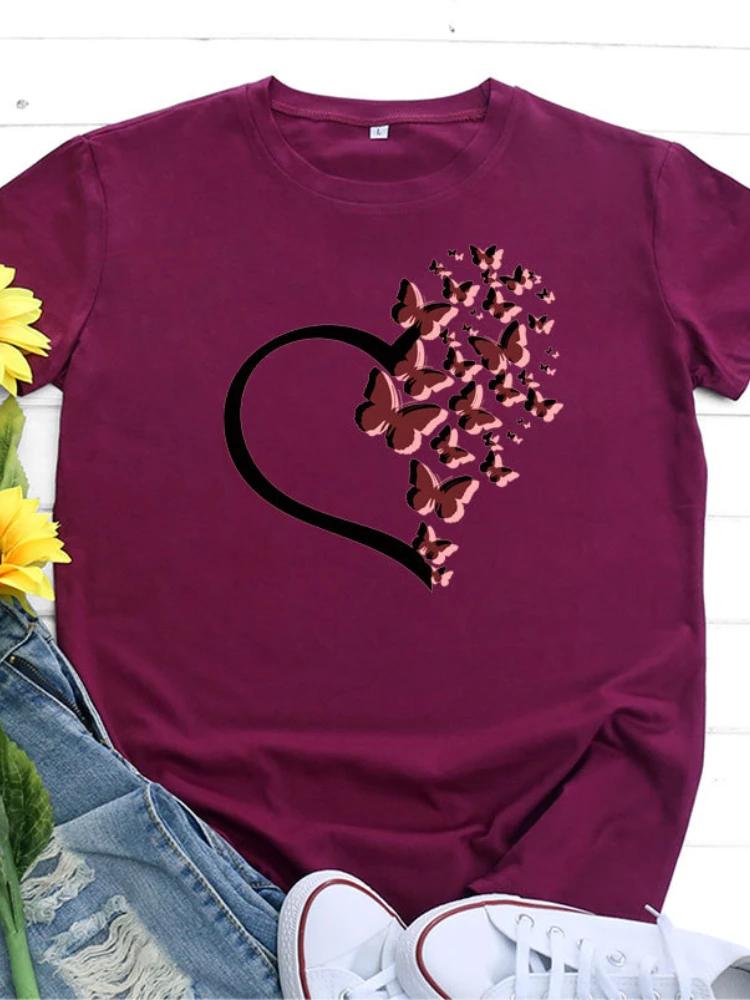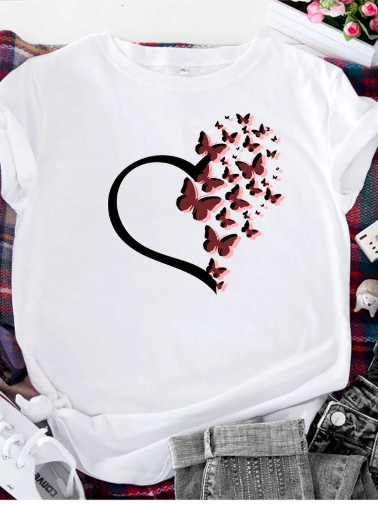 Футболка с принтом «сердце-бабочка» женская с коротким рукавом и круглым вырезом, свободная футболка, летняя женская футболка, топы, Camisetas Mujer