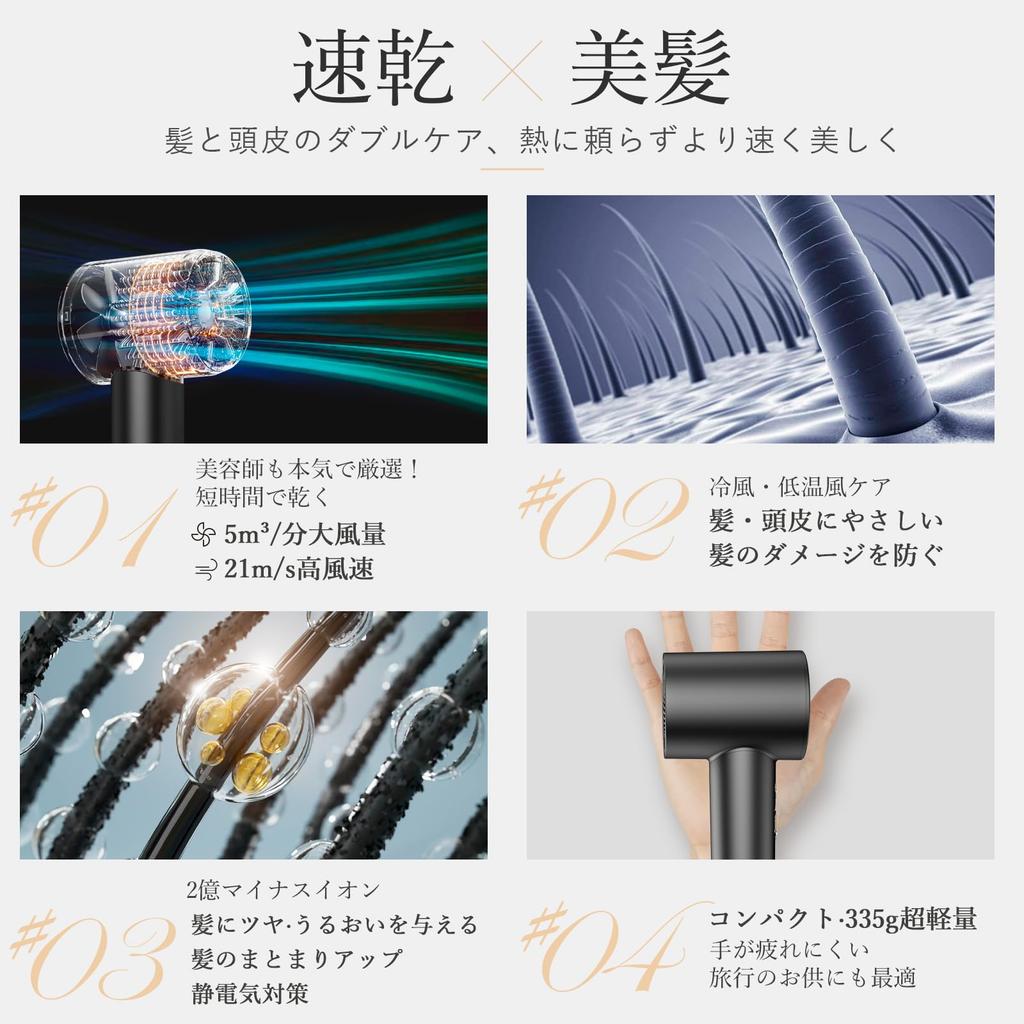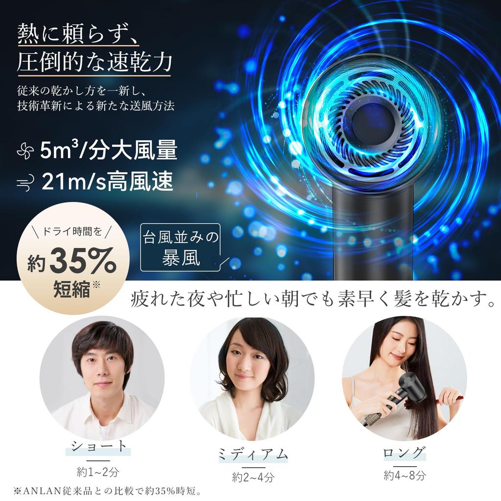 ・[Large air volume of 5 m³/min x 21 m/s high wind speed] This hair dryer is a hair dryer that does not rely on heat and has improved its "quick drying power" to completely change the conventional method of drying.With a new method of blowing air through technological innovation, it has a large air volume of 5 m³/min and a maximum wind speed of 21 m/s, comparable to that of a typhoon, allowing you to dry your hair quickly while protecting your hair and scalp.