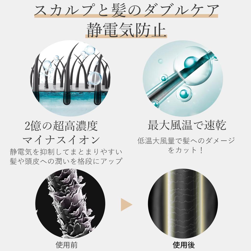 ・[Minimize hair damage! Prevent static electricity! ] The ultra-high concentration of 200 million negative ions significantly increases the water retention capacity of hair and scalp compared to conventional hair dryers, and reduces cuticle damage and static electricity. The dryer's maximum air flow is gentle on the scalp and hair, and its extremely quick drying properties shorten the time it takes to receive heat, minimizing damage to the hair.The dryer is unique in that it takes care of your hair and scalp by continuing to use it every day.
