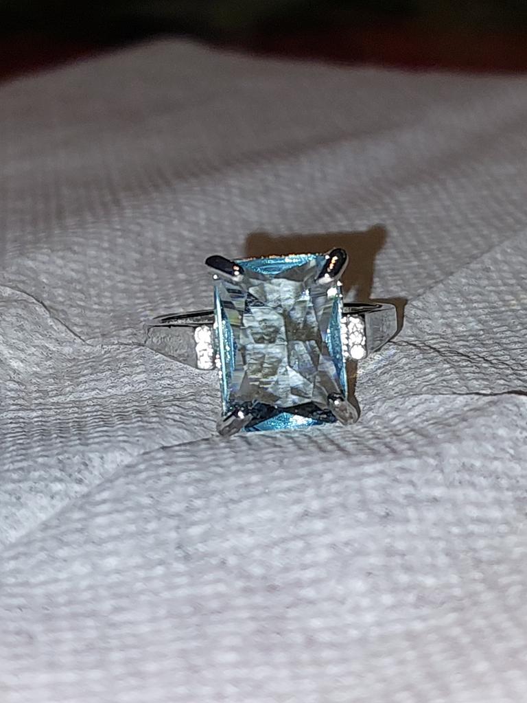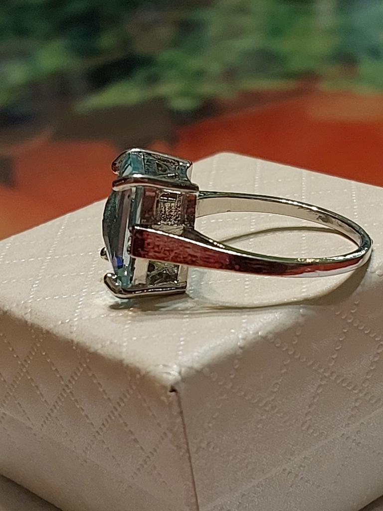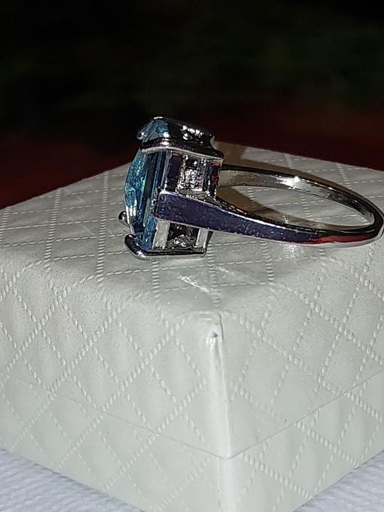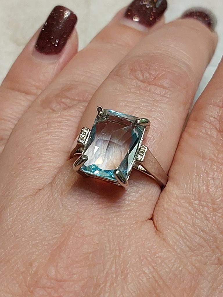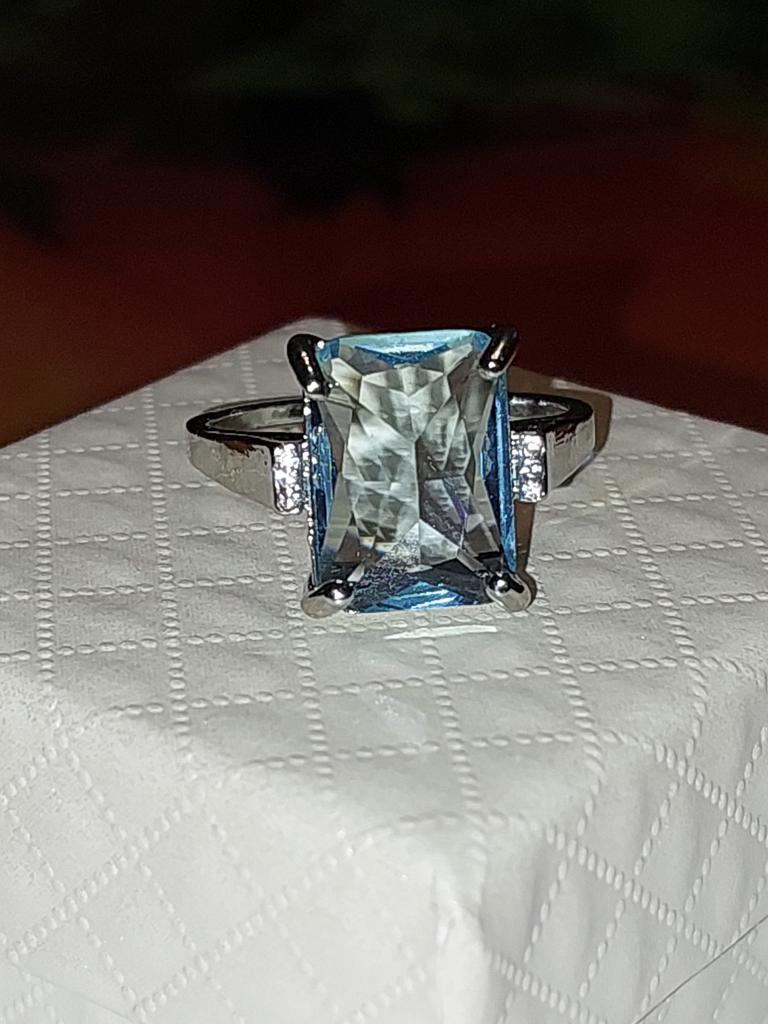 Очень красивое кольцо! Вставка похожа на голубой топаз, чистый и прозрачный, не пластик. Сделано достаточно аккуратно. Но, кажется, в моём кольце камень поставили наоборот, выпуклой стороной вверх. Интересно, почему? Это невнимательная работа на производстве? Или такой креативный подход? А получилось-то неплохо, всё равно красиво. Размер 10 подходит на наш 20 размер. К покупке рекомендую. До Москвы посылка шла три недели.
