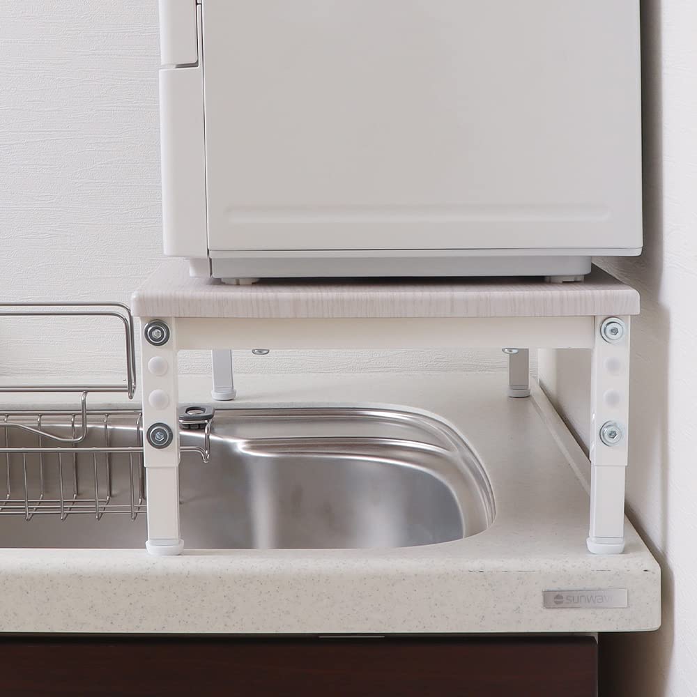 Эффективно используйте мертвое пространство. Посудомоечную машину, которая обычно занимает много места, можно аккуратно хранить в неиспользуемом пространстве.. Это выдвижная полка для посудомоечной машины, которую можно разместить над раковиной.. Вы можете выбрать между рисунком под мрамор и рисунком под дерево.. Грузоподъемность составляет около 30 кг.. Выдерживает мытье в стандартной посудомоечной машине без каких-либо проблем.. Высота ножек регулируется на 3 уровнях в соответствии с вашими потребностями.. Высота позволяет легко чистить.. Вы также можете настроить его в соответствии с вещами, которые вы храните.. Вы также можете повесить S-образный крючок в отверстие для болта регулировки высоты.. Кроме того, если вас беспокоит дребезжание, вы можете отрегулировать его с помощью регулятора.