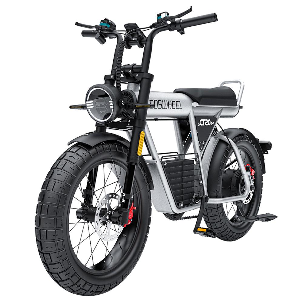 Внедорожный электрический велосипед COSWHEEL CT20S оснащен аккумулятором 60 В, 27,5 Ач и запасом хода до 100 миль. (160 км) и максимальная скорость 40 миль в час (65 км/ч).