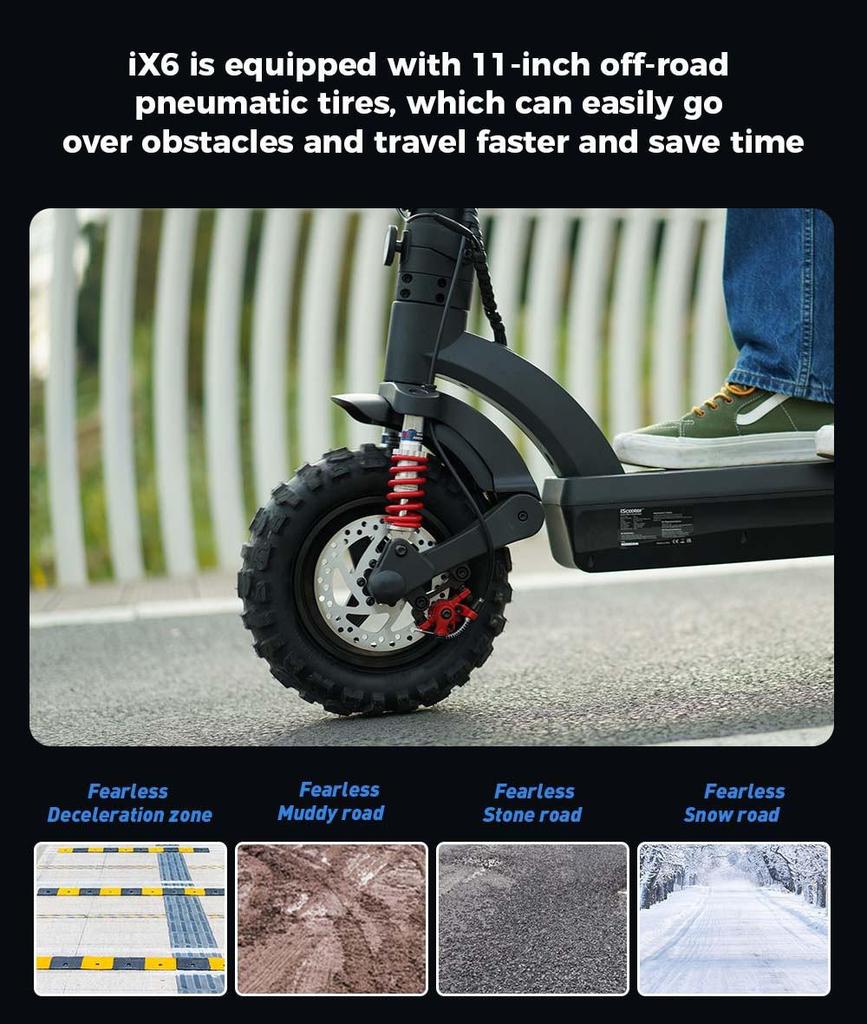 Внедорожный электросамокат iX6 с большими колесами по сравнению со средними шинами, модернизированные 11-дюймовые внедорожные шины повышают долговечность, прочность и комфорт.