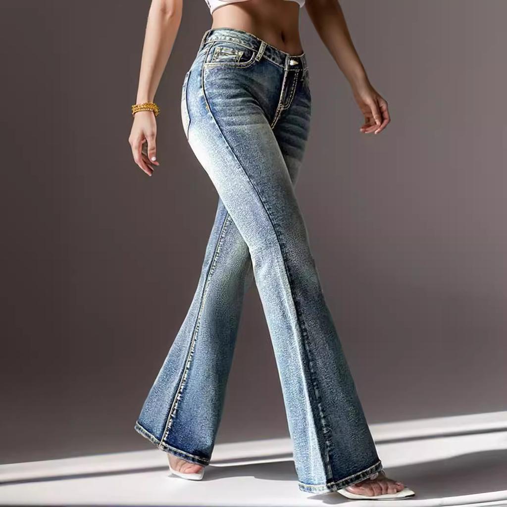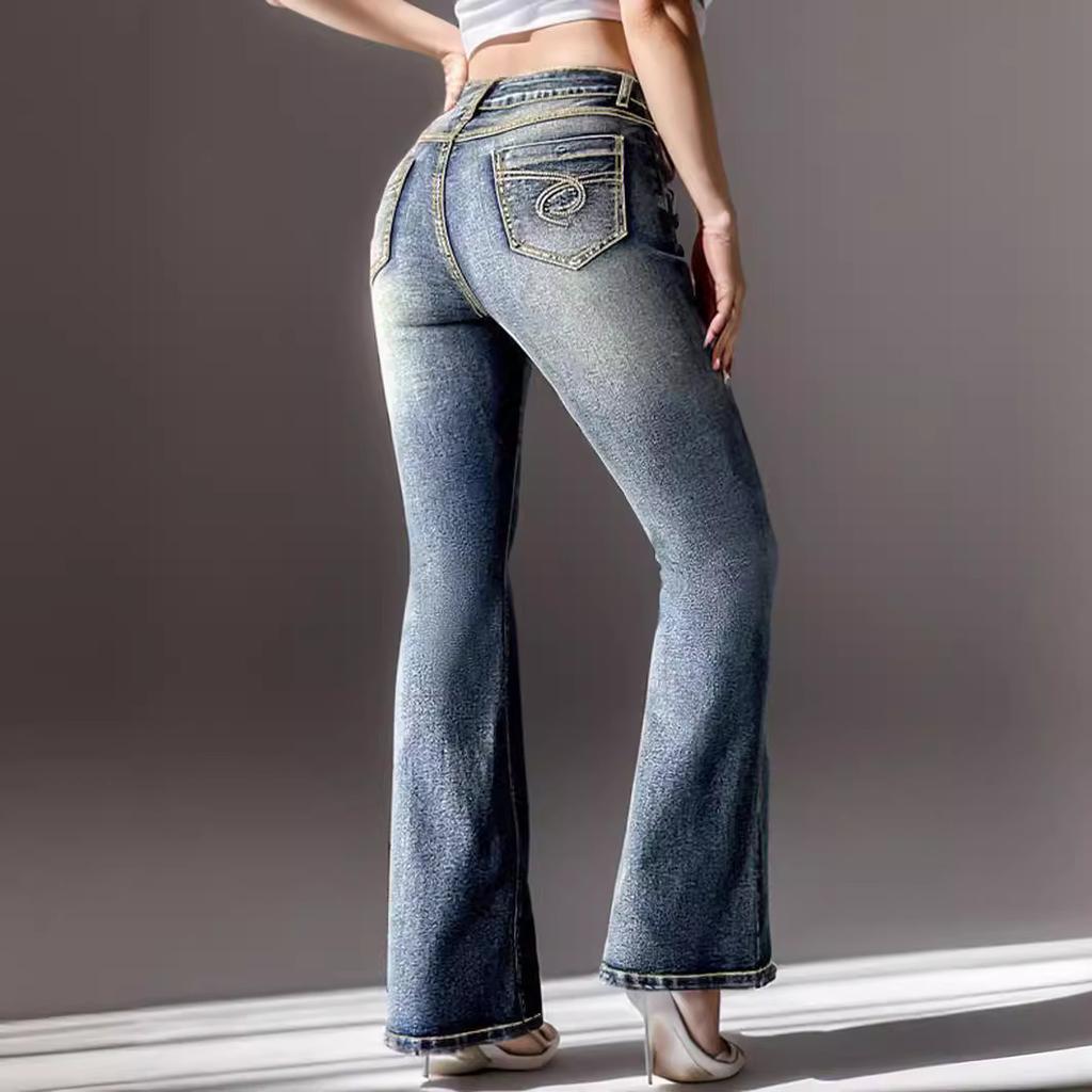 GMXIA Женские винтажные джинсы с высокой эластичностью и вышивкой на карманах, облегающие расклешенные брюки