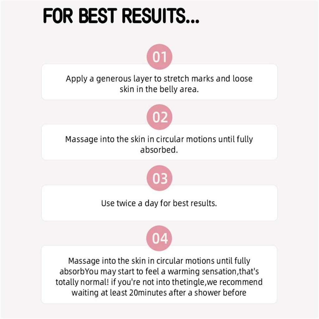 Растяжки: Крем для укрепления кожи живота специально разработан для уменьшения видимости растяжек, подтяжки живота, разглаживания и укрепления обвисшей кожи, делая ее более упругой и гладкой.. Будь то восстановление после родов или улучшение текстуры кожи, крем для укрепления кожи живота обеспечит вам идеальный уход за кожей живота.