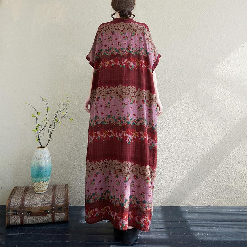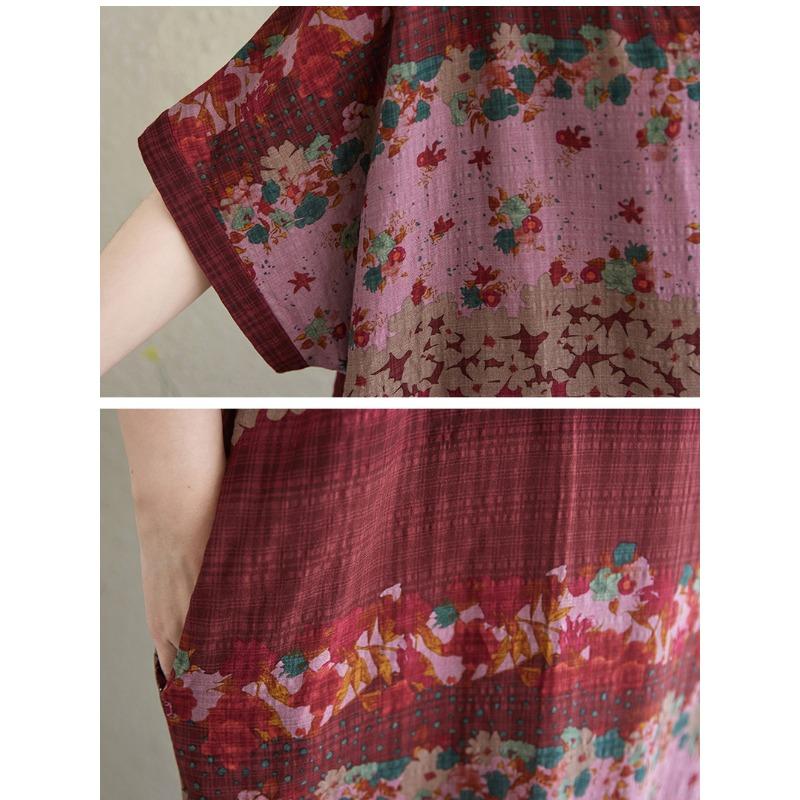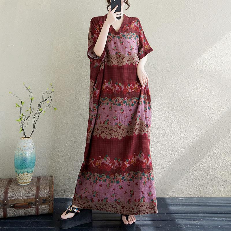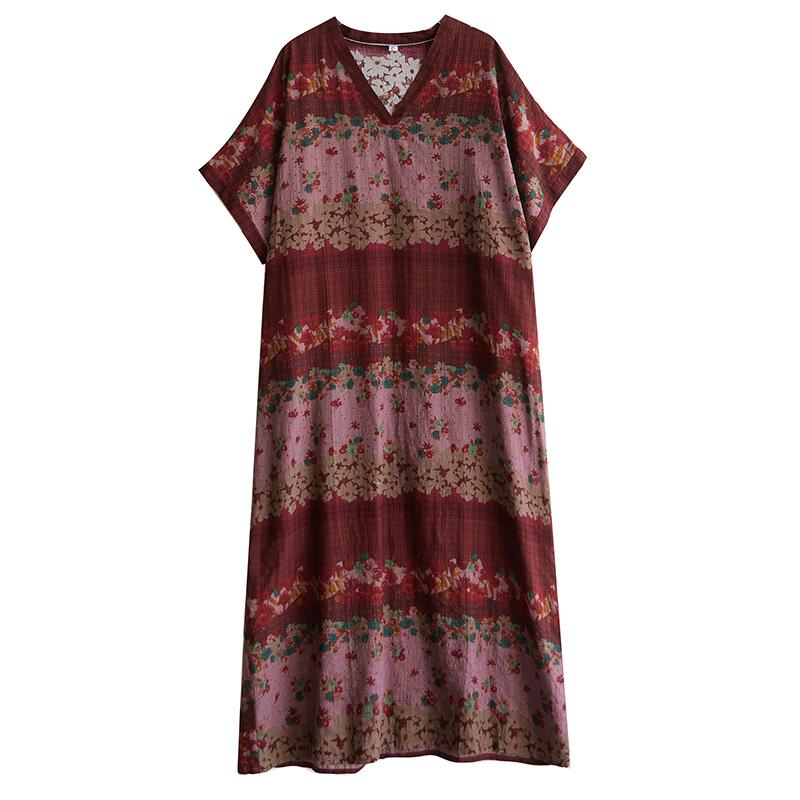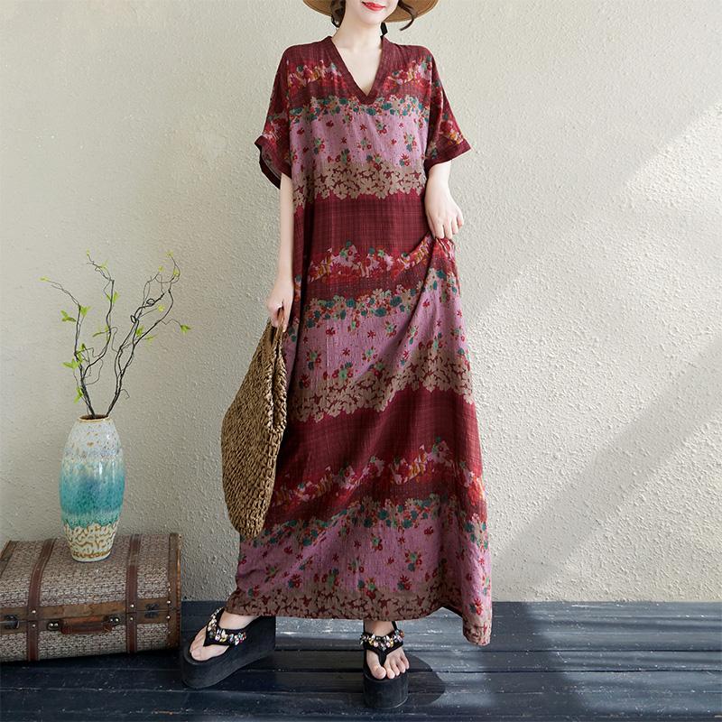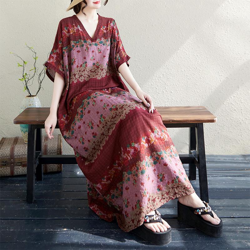 DIMANAF Большой размер 2025 Лето Длинное платье V-образный вырез Женское Лен Винтаж Пляжное Повседневное платье Базовое Свободное платье Цветочное
