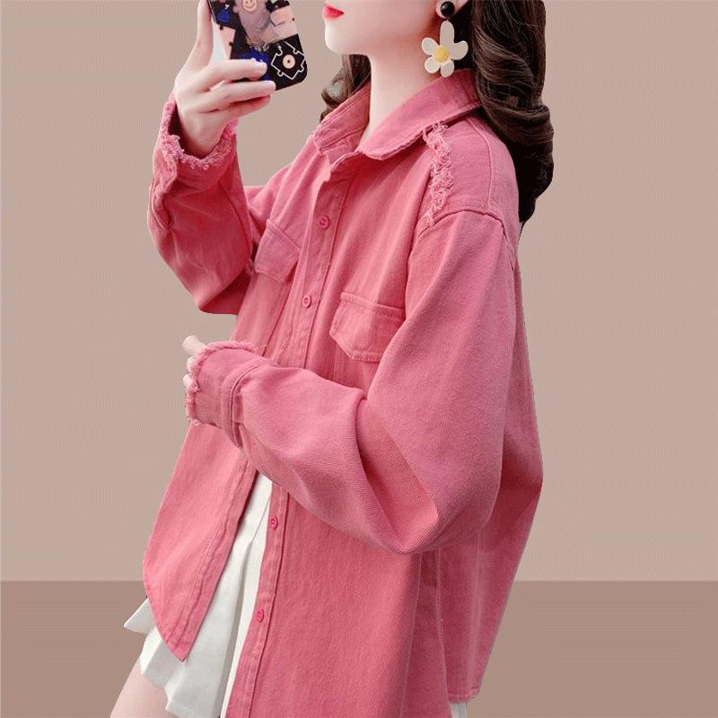 Ранняя весна Молодежная и элегантная многослойная куртка для женщин с воротником и карманом Простая однотонная джинсовая рубашка