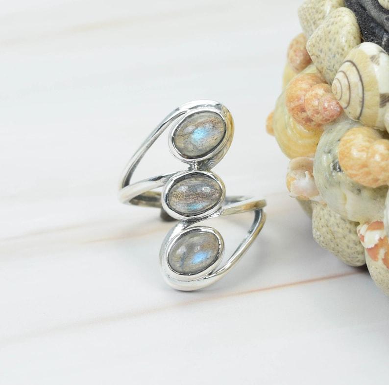 Кольцо с драгоценным камнем лабрадорит, дизайнерское кольцо ручной работы, кольцо с тремя камнями, обручальное кольцо, модные украшения