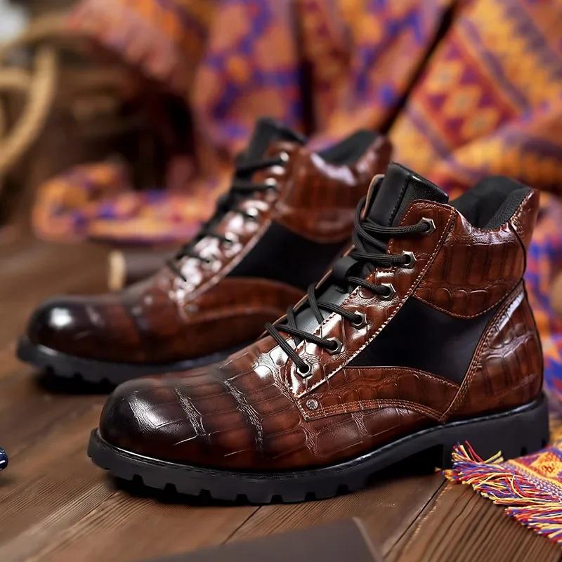 Мужские блестящие ботинки средней высоты, модные мужские ботинки из крокодиловой кожи на шнуровке, нескользящие мотоциклетные ботинки на толстой подошве, большой размер 38-46