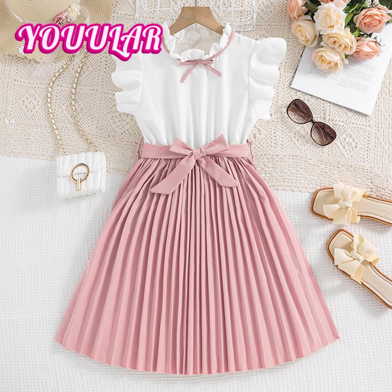 Платье для девочек Детская одежда Лето 2025 Новый стиль Рукава-крылышки Цветные блоки Темперамент Плиссированная юбка — купить товар онлайн с бесплатной доставкой по всему миру!