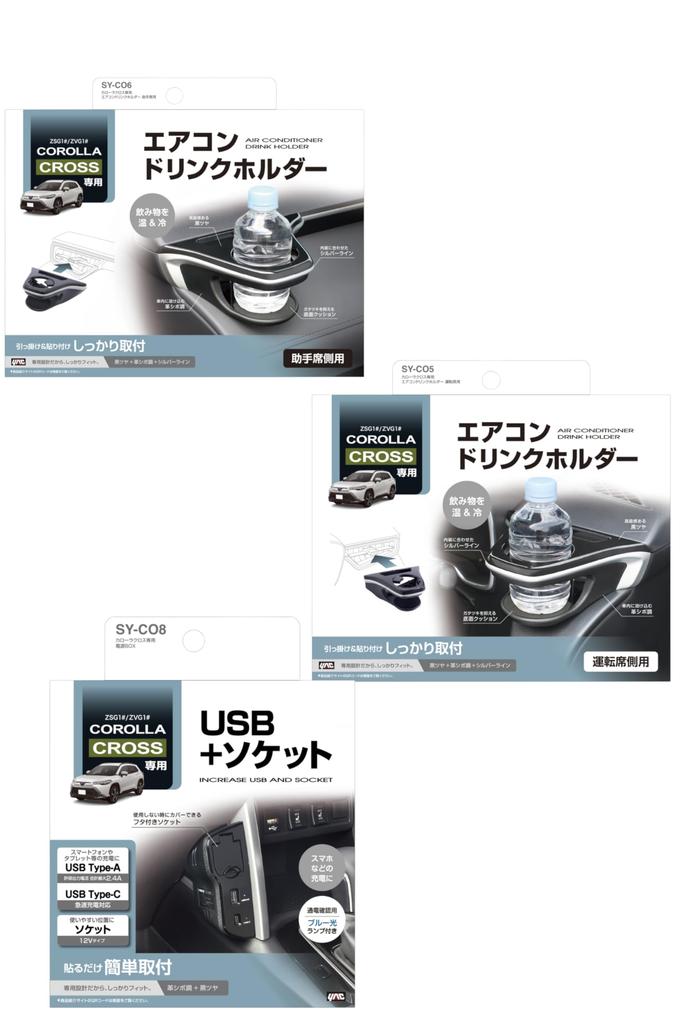 SY-CO5 и SY-CO6 Подстаканник для кондиционера Corolla Cross Описание продукта Только для Corolla Cross с правым рулем (ЗСГ1#/ЗВГ1#) Кондиционер подает воздух, сохраняя напитки горячими и холодными. Специально разработан для идеальной установки на вентиляционную панель кондиционера. Простая установка путем зацепления защелок и приклеивания двухсторонним скотчем. Не мешает движению пластин кондиционера. Поставляется с нижней подушкой, предотвращающей колебание напитков. Можно хранить небольшие банки, банки объемом 350 мл, пластиковые бутылки объемом 500 мл/600 мл, кофе из магазина у дома и т. д.. Он может быть несовместим с транспортными средствами, которые претерпели незначительные изменения с момента проведения обследования. (по состоянию на февраль 2022 г.) Данный продукт нельзя устанавливать на автомобили, на которых установлены дополнительные опции вокруг установочной части.. SY-CO8 Блок питания для Corolla Cross Описание продукта Только для Corolla Cross с правым рулем (ЗСГ1#/ЗВГ1#) Специально разработан для идеального вписывания в интерьер. Также может быть установлен в автомобилях, оборудованных CD/DVD, что является оригинальной опцией. USB-порт имеет функцию автоматического распознавания, которая подает и заряжает оптимальный ток в соответствии с подключенным устройством, поэтому его можно использовать с планшетами, iPhone, смартфонами, мобильными телефонами и т. д.