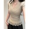Летние хлопковые сексуальные кружевные футболки, женские футболки с глубоким V-образным вырезом и короткими рукавами, повседневные, тонкие, эластичные, облегающие, y2k, укороченные топы, женская одежда