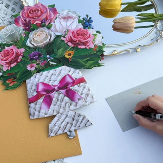 Цветущая элегантность: Насладитесь красотой 3D-дизайна, который при открытии представляет собой реалистичный букет срезанных цветов, вызывая чувство удивления и радости у любого получателя.