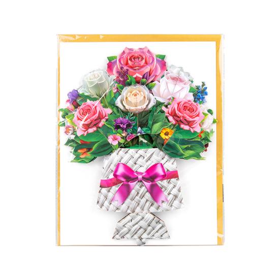Эта изысканная открытка с букетом цветов — настоящее произведение искусства, изготовленное из прочной художественной бумаги с тщательно вырезанными вручную деталями и яркой печатью.. Изысканный дизайн и яркие цвета делают его памятным сувениром на все времена.