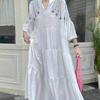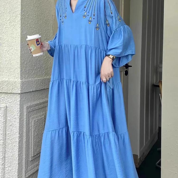 Clothland Женское Элегантное Вышитое Платье V-образный Вырез Расклешенные Рукава Свободный Стиль Цельный Ретро Миди Платья