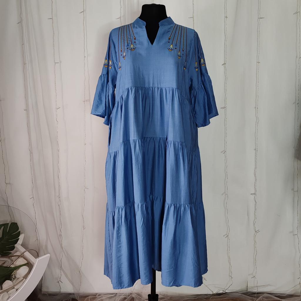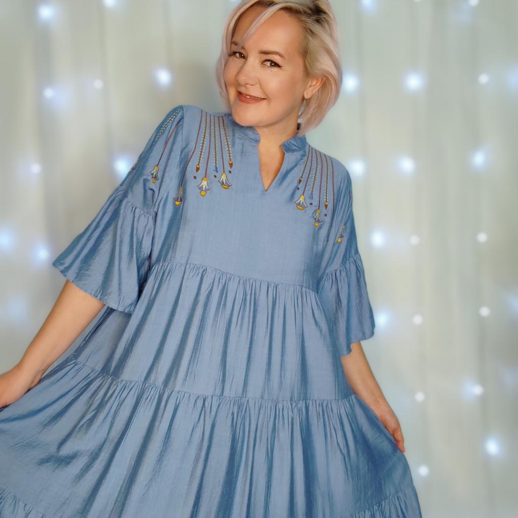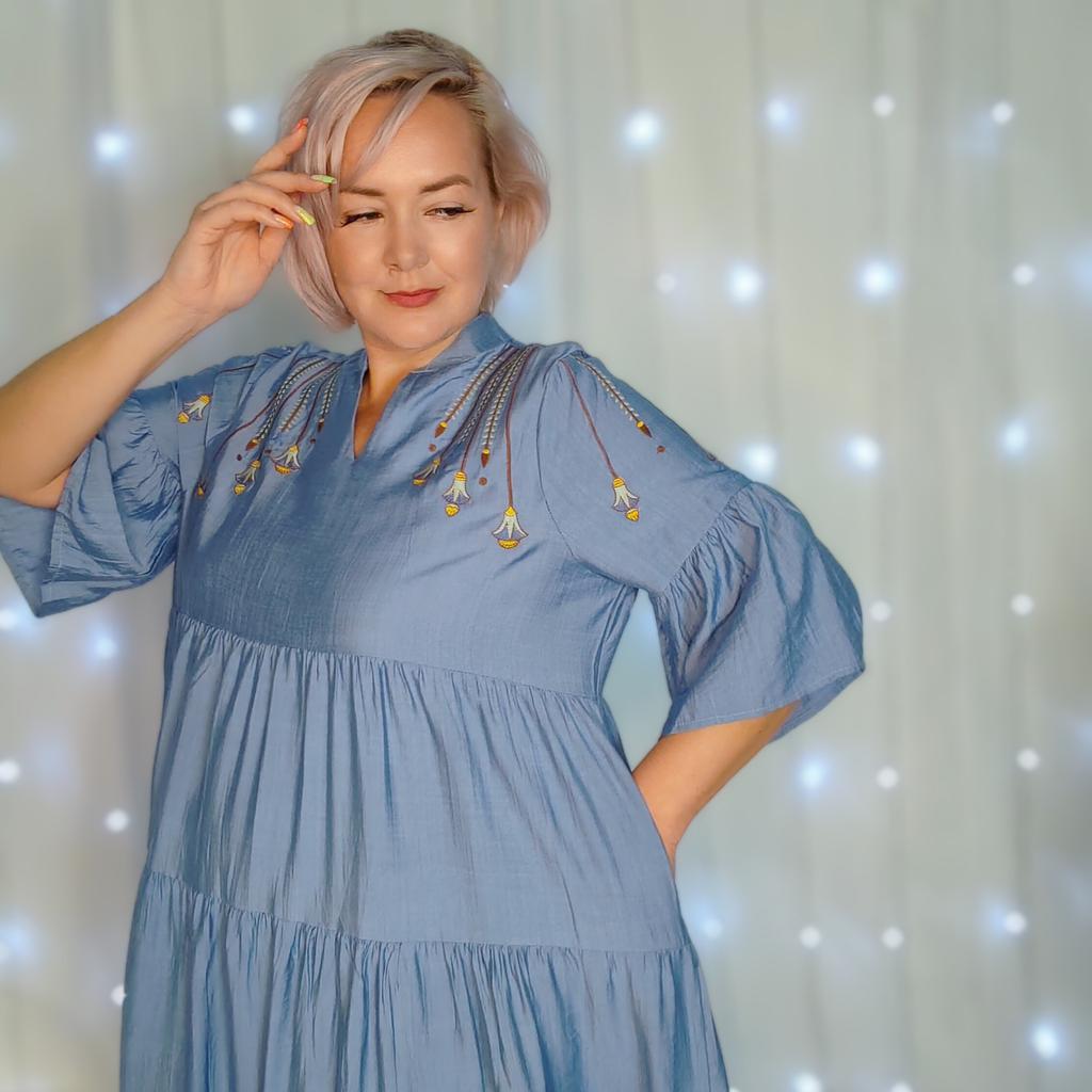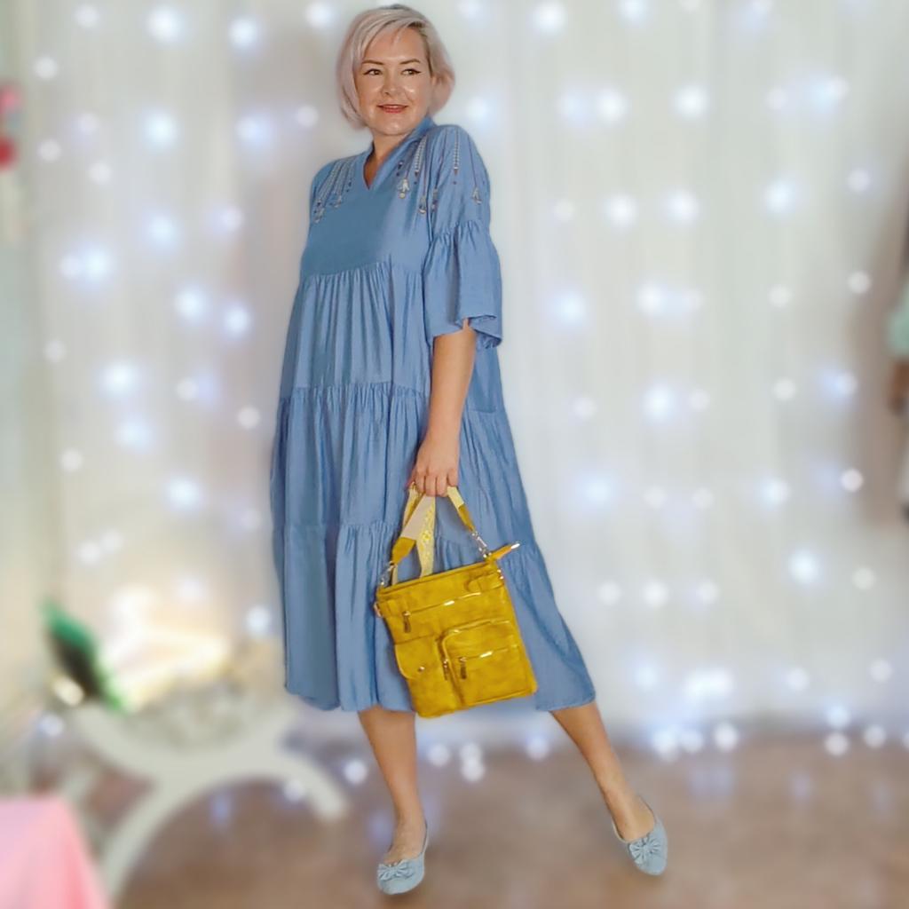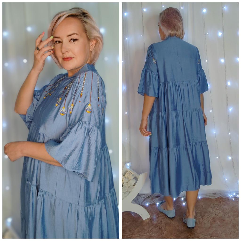 Идеальное свободное платье из натуральной ткани. Рекомендую это платье всем, кто любит комфорт, красоту и женственность. Ткань: Похожа на ситец, приятная и мягкая ткань. Не тянется, лёгкая и воздушная. Не просвечивается, но мнется. Дизайн: Платье выполнено в виде трапеции состоит из нескольких волонов нашитых друг на друга. Украшены аккуратный вышевкой на плечах. Есть карманы по бокам. Размер: На мне единый размер Мои параметры : рост 172 см 98/76/106 см Детали: Длина 125 см Плечи 36 см ОГ 124 см ОТ 126 см ОБ 160 см Резюмирую: Достойное платье! Очень удобное, уютное, не жаркое и главное стройнит не смотря на свой свободный крой! Прям рекомендую 👍 Я не прощаюсь, M_K #голубое_платье