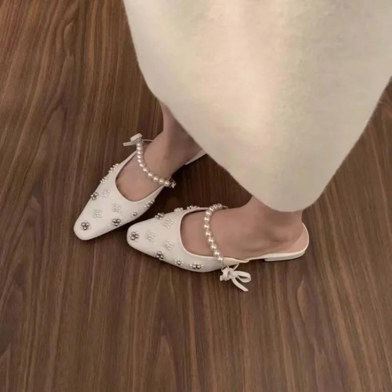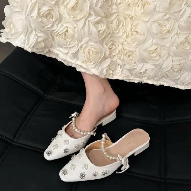 Женские тапочки Новые мюли Платье с кристаллами и жемчугом Вьетнамки Женские дизайнерские туфли Мэри Джейн с острым носком Босоножки на низком каблуке