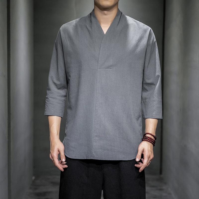 Футболка в китайском стиле из хлопка и льна с короткими рукавами и V-образным вырезом, летняя мужская льняная футболка в стиле ханьфу с рукавом три четверти