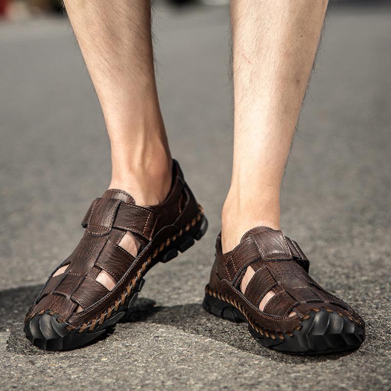 Foreign trade explosion large size sandals 2024 new casual trend bag head genuine leather one-pedal men's beach shoes — купить товар онлайн с бесплатной доставкой до всему миру!