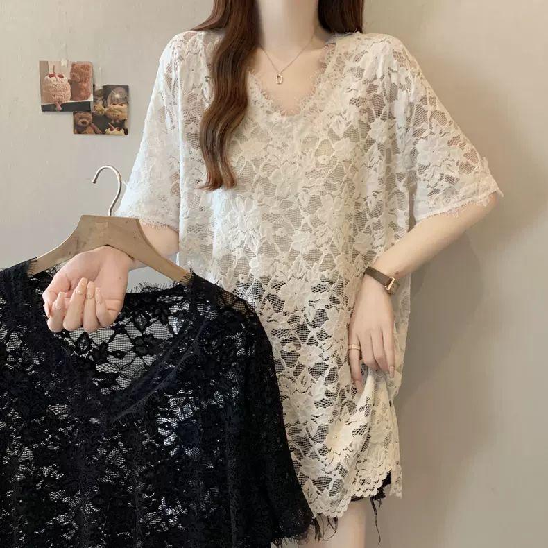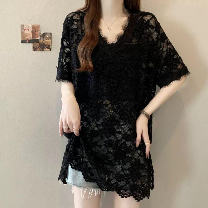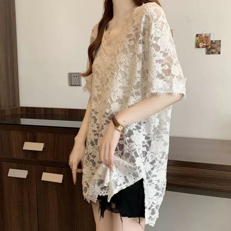 Тонкая и слегка прозрачная кружевная рубашка с V-образным вырезом и передним плечом, очень свободный топ средней или длинной длины с короткими рукавами для женщин