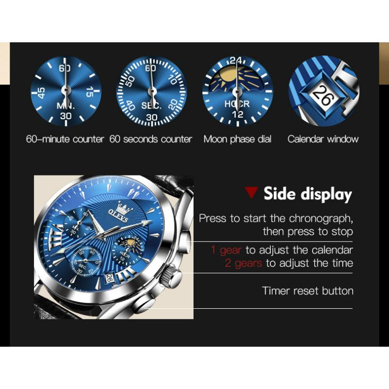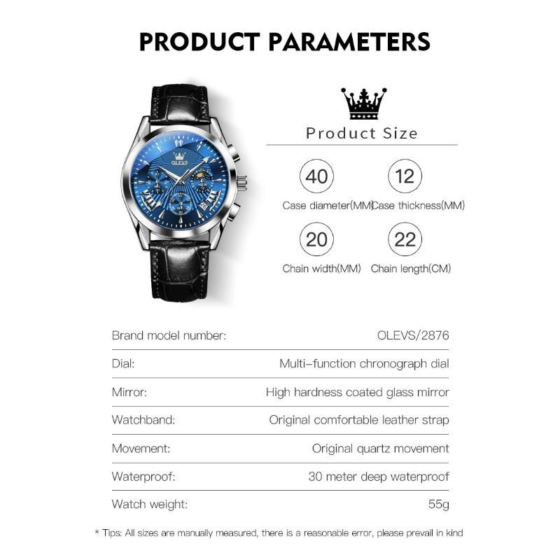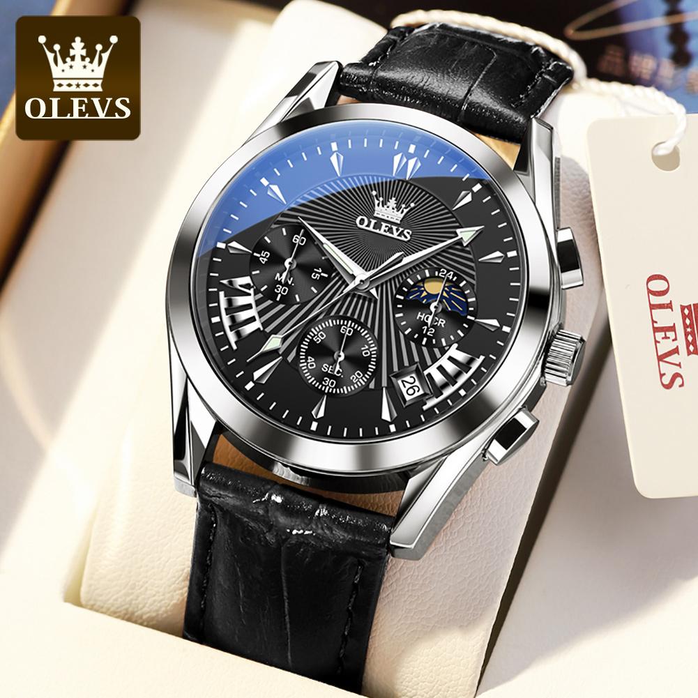 OLEVS 2876 Многофункциональные роскошные часы с кожаным ремешком для мужчин, кварцевые спортивные водонепроницаемые светящиеся мужские наручные часы