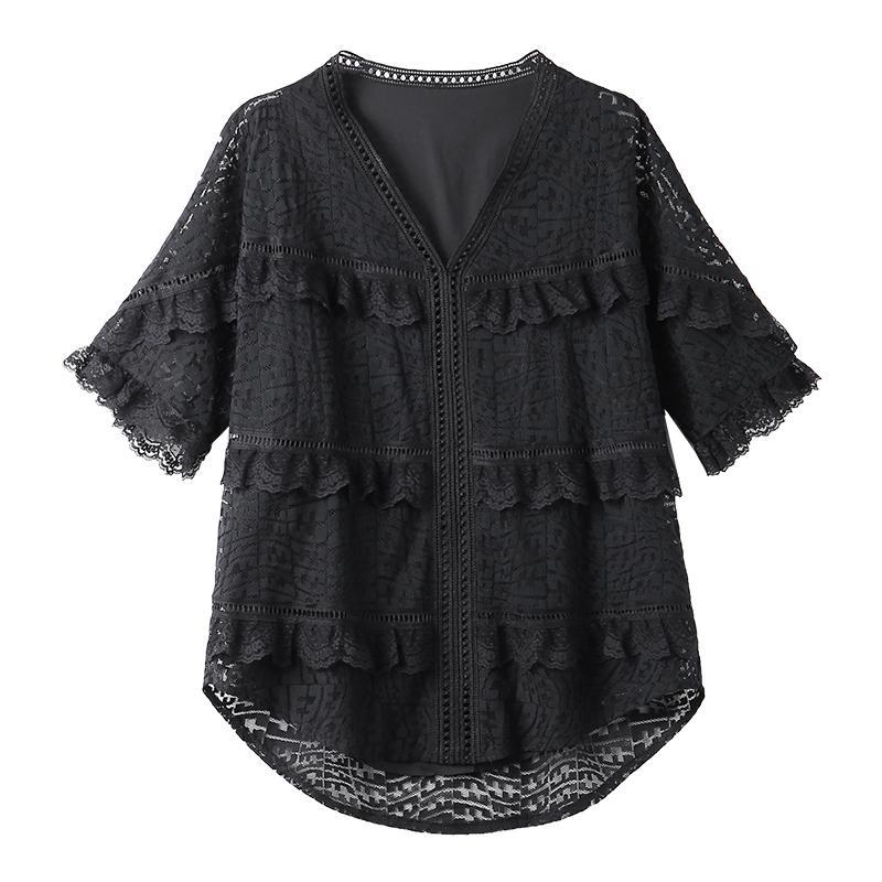 Вышитая кружевная рубашка с V-образным вырезом и короткими рукавами, свободная и модная рубашка из шифона для женщин длиной до середины икры