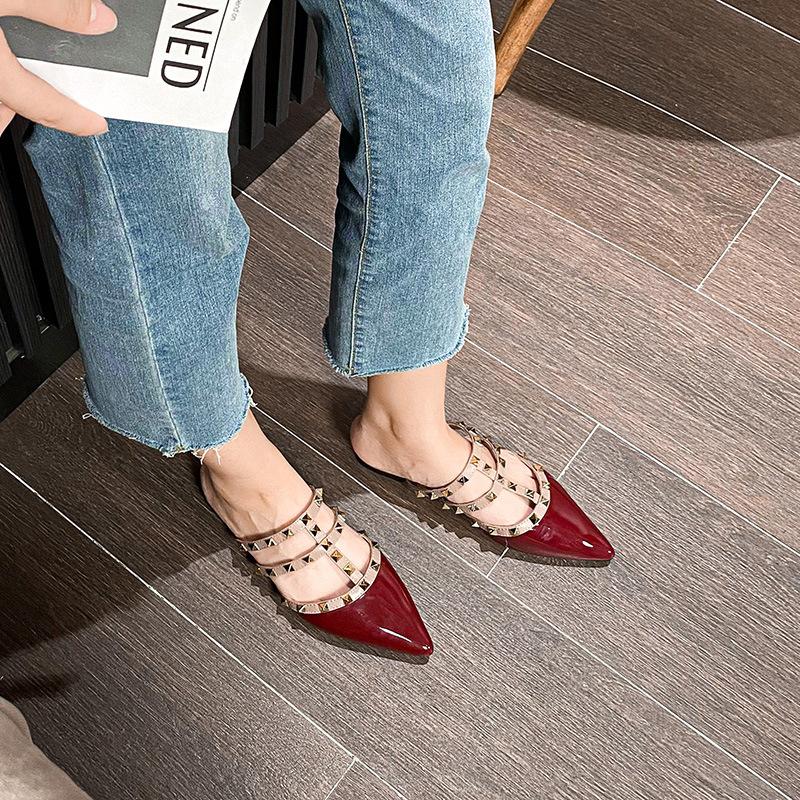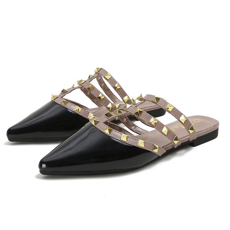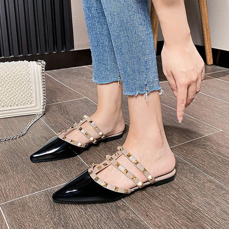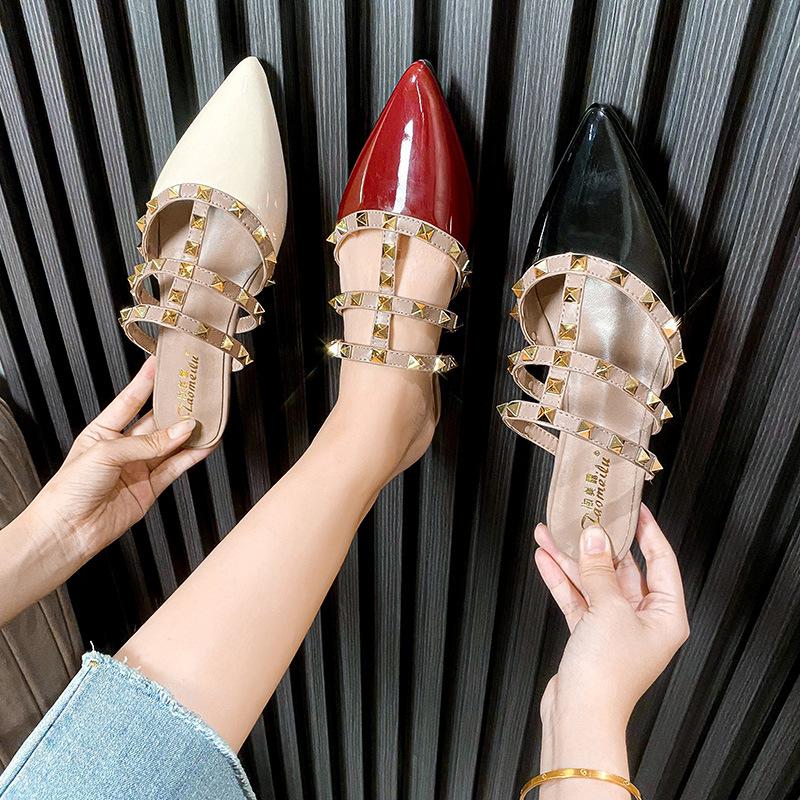 2025 весна новые сандалии на плоской подошве женские летние сандалии с сумкой на голову полуперетягивающиеся темперамент заклепки остроносые тапочки носить заклепки обувь