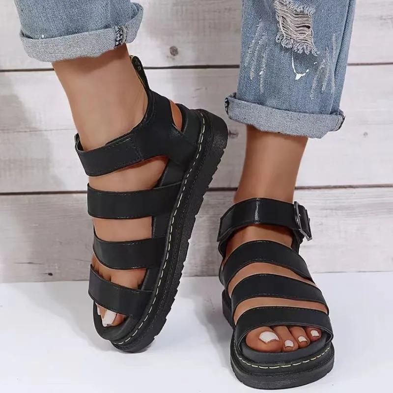 Пятно Большие летние новые толстые подошвы однорядные повседневные римские сандалии женские туфли с круглой пряжкой