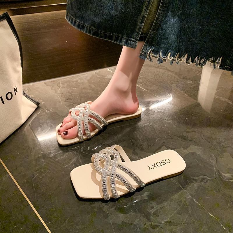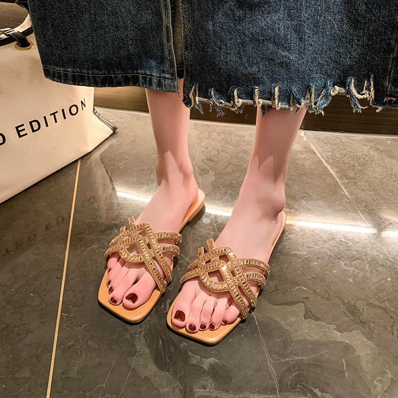 Женские летние модные шлепанцы с квадратным носком и открытым носком, новые со стразами и перфорацией, пляжные женские балетки, Mujer Zapatosa