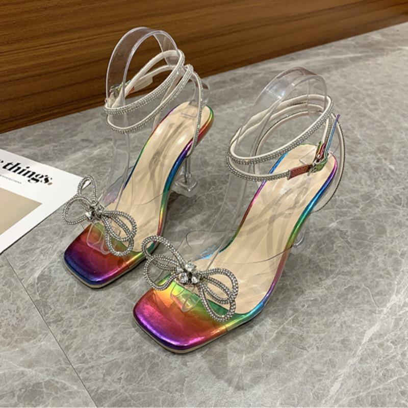 Женские летние новые модные женские босоножки со стразами и бантом, повседневные, с квадратным носком, с открытым носком, на высоком каблуке, для вечеринок, Mujer Zapatos