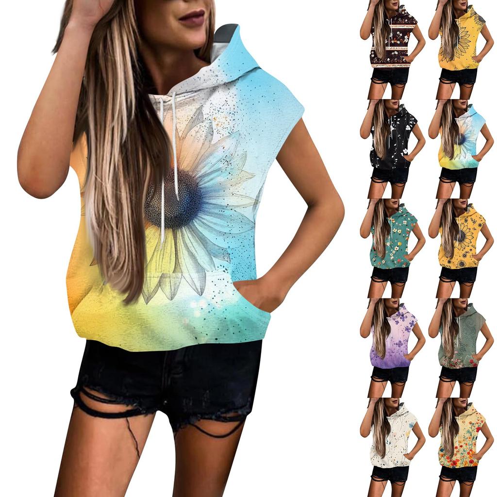 Женские летние футболки без рукавов с капюшоном, толстовки с капюшоном, свободные повседневные туники, толстовки