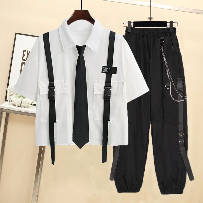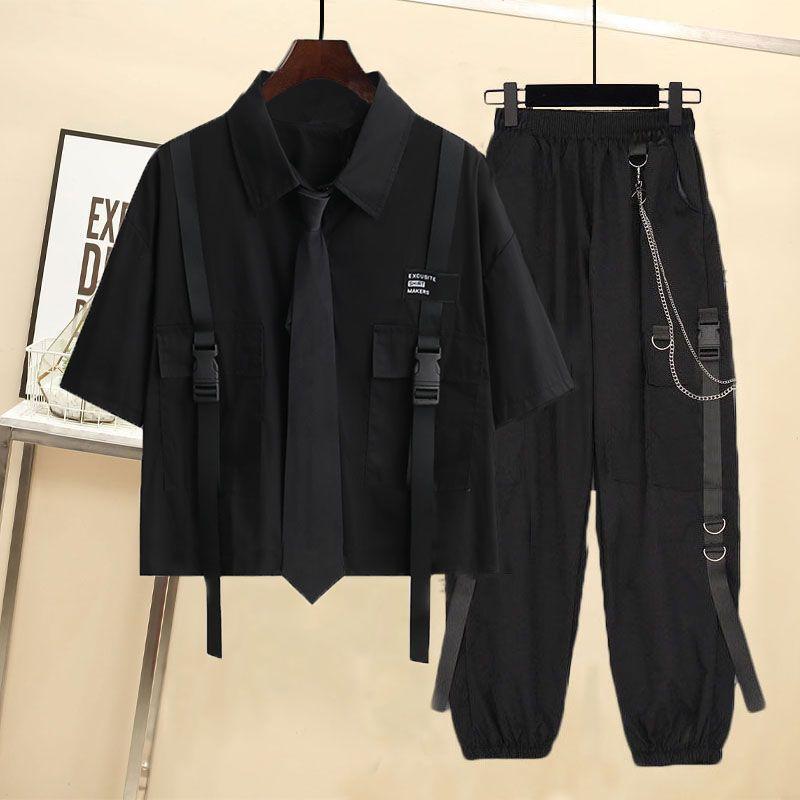 Женский комплект брюк карго Харадзюку, повседневная рубашка, топ с короткими рукавами, высокая талия, свободные брюки-джоггеры, женские брюки, уличная одежда