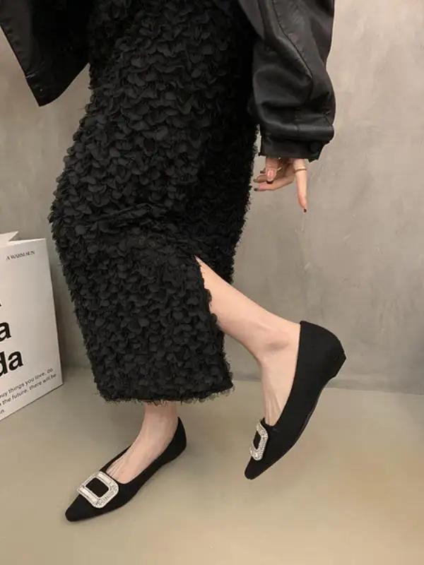 Летняя обувь женская на низком каблуке с кристаллами и мелким носком, черные туфли на плоской подошве, женская обувь без застежек, модная женская обувь со стразами, новая обувь без застежек