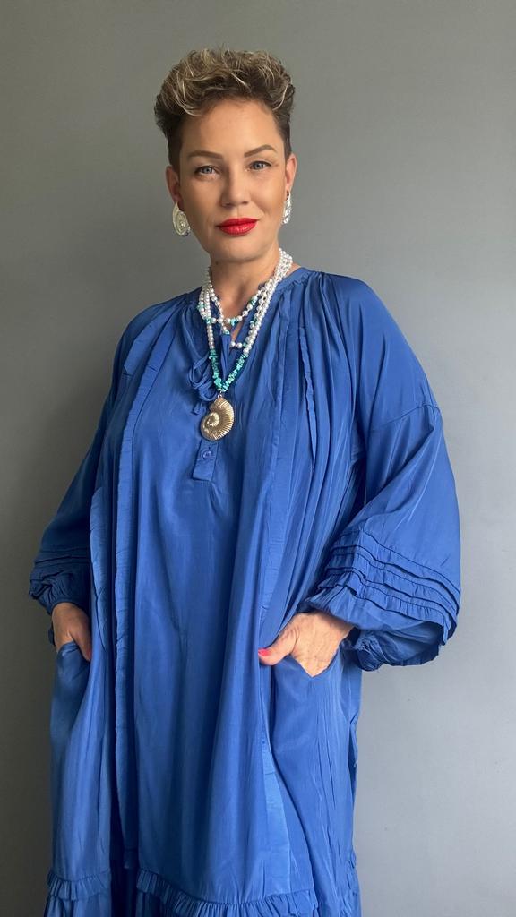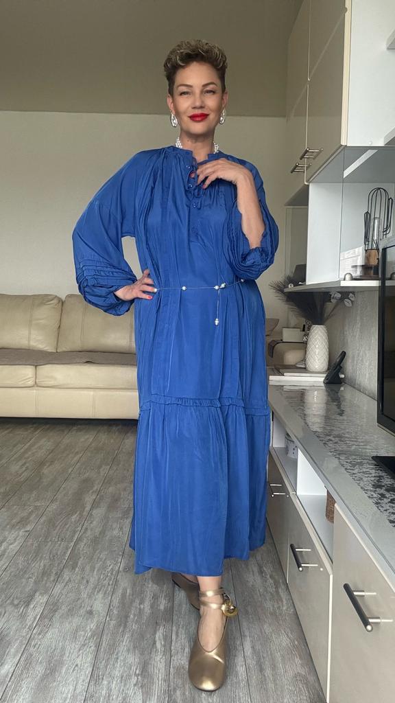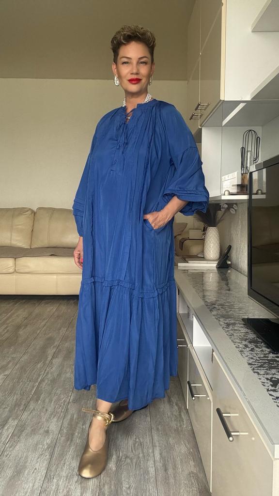 Платье 👗 цвета ультрамарин ✔️Огромный выбор расцветок Размер единый Мои параметры: рост 167, 98-85-100 Платье подойдёт на параметры больше моих, и более высокий рост ✔️Фасон: А- силуэт Отрезное по линии бедер Рукав реглан В боковых швах карманы На рукавах внизу резинка Карманы украшены складками Такие же складки идут сверху вниз Воротник стойка Застёгивается на пуговицы На шее шнурок ✔️Ткань: Лёгкая, приятная на ощупь, легко утюжится, мнется умеренно Не тянется Визуально похожа на вискозу Пошив аккуратный Карманы с изнанки не обработаны 📐Замеры: Плечи нет Длина рукава от горловины 66 Пройма 30 Ширина рукава 25 ОГ подмышками 132 ОТ 140 ОБ 160 Длина 126